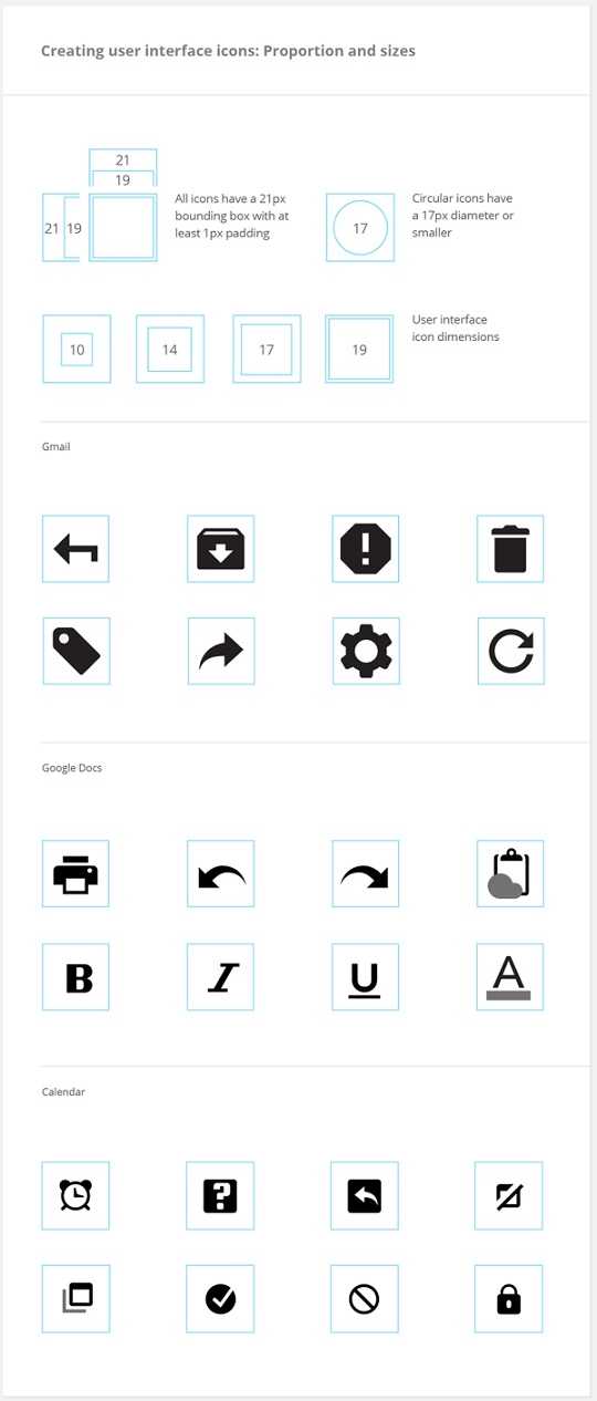 用户界面icon创作要求:尺寸和比例——同样,兼顾排列和大小,icon各自有着相应的形状,但是通过留白的边框产生一个统一而透明的外壳,这里用了Gmail、Google Docs和Google Calendar的用户界面icon作为示范。