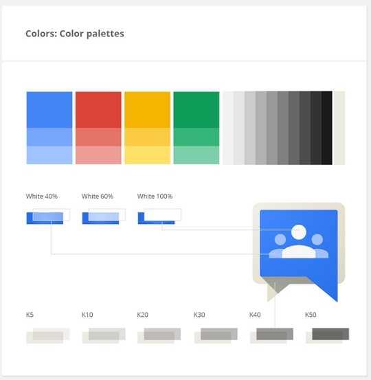色彩:调色原理——Google反对贸然使用新的颜色,就像画家通过调色板来将一种色彩调出更多深浅不一的颜色,Google也喜欢使用“透明度”这种调色方式来扩大画面必须的丰富程度。