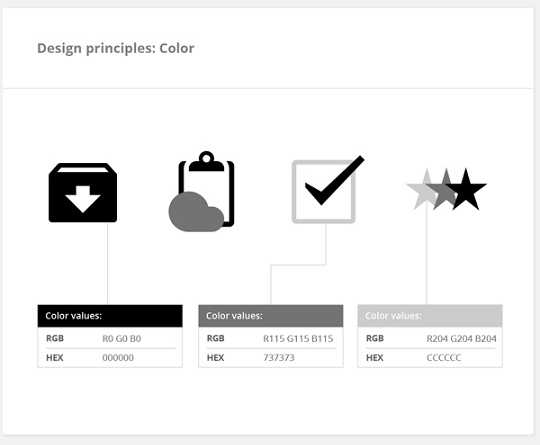 设计准则:深浅配色——由于缺少色彩进行区隔,这些icon利用深浅明暗来优化视觉认知,灰度的使用亦遵照设计规定。