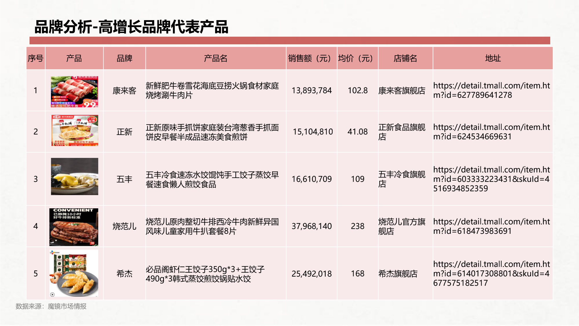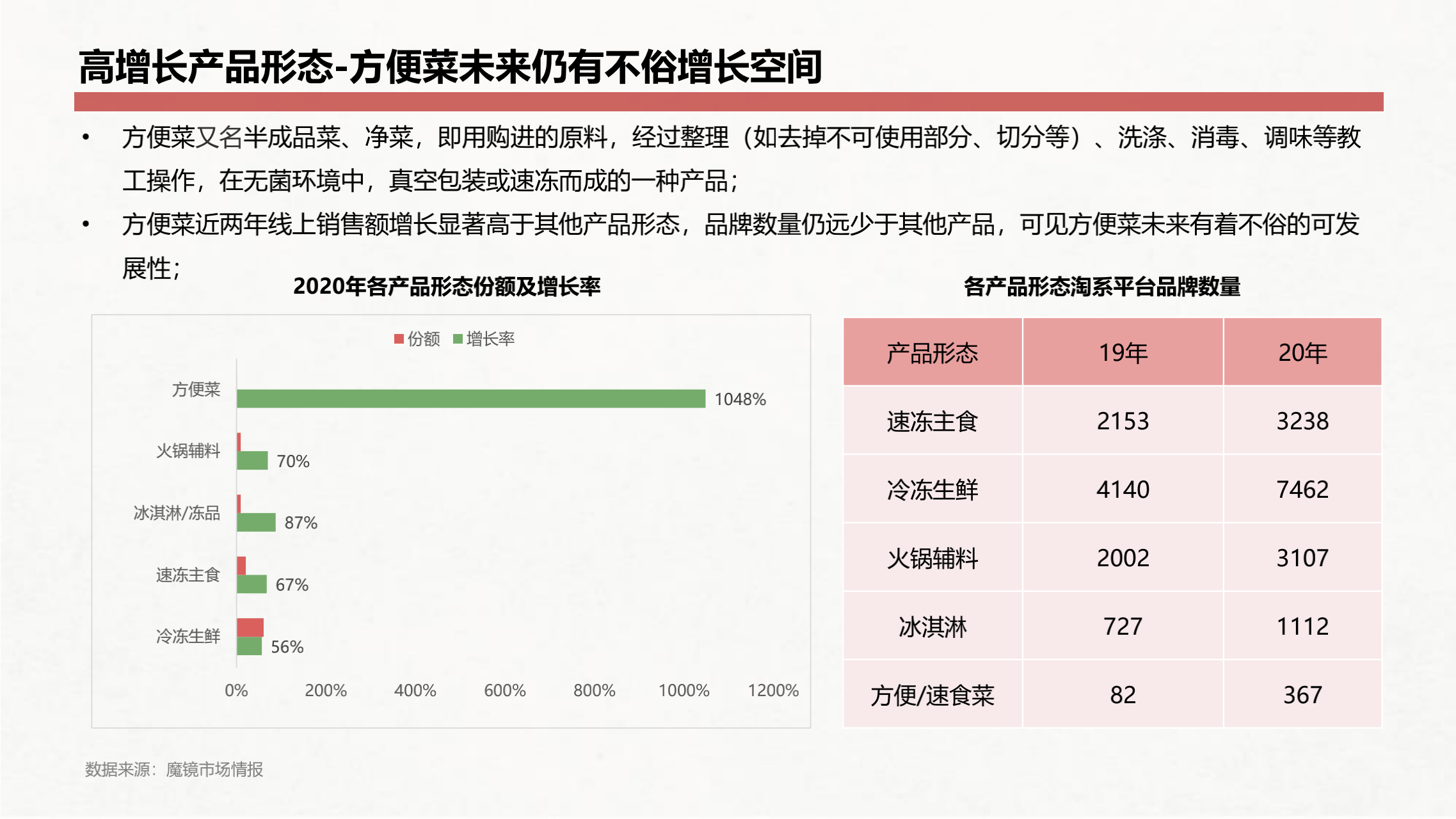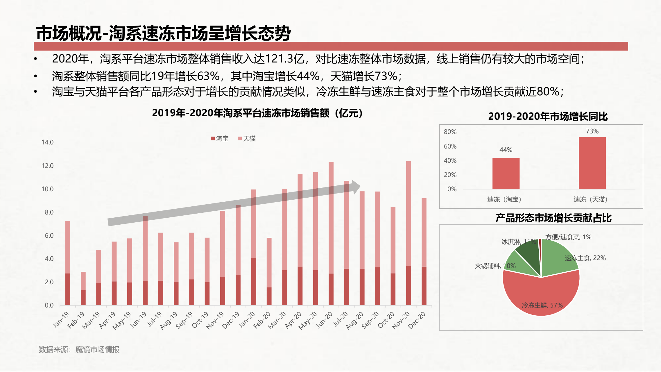 - 淘宝与天猫平台各产品形态对于增长的贡献情况类似,冷冻生鲜与速冻主食对于整个市场增长贡献近80%;