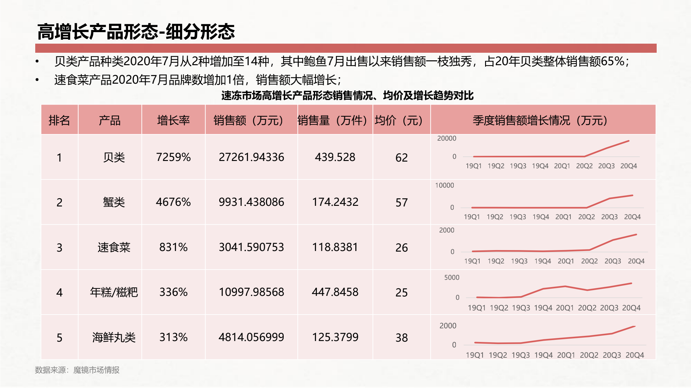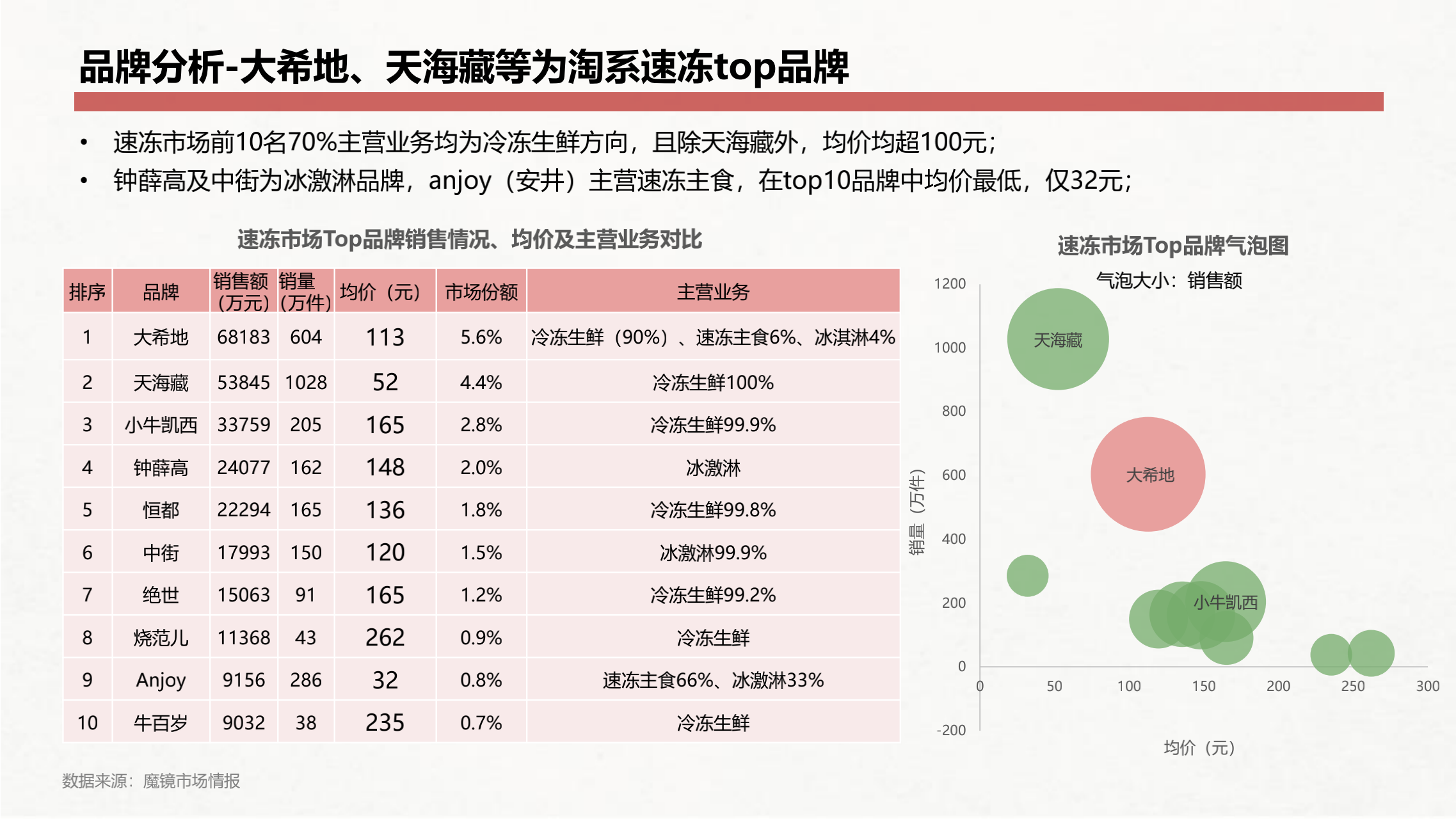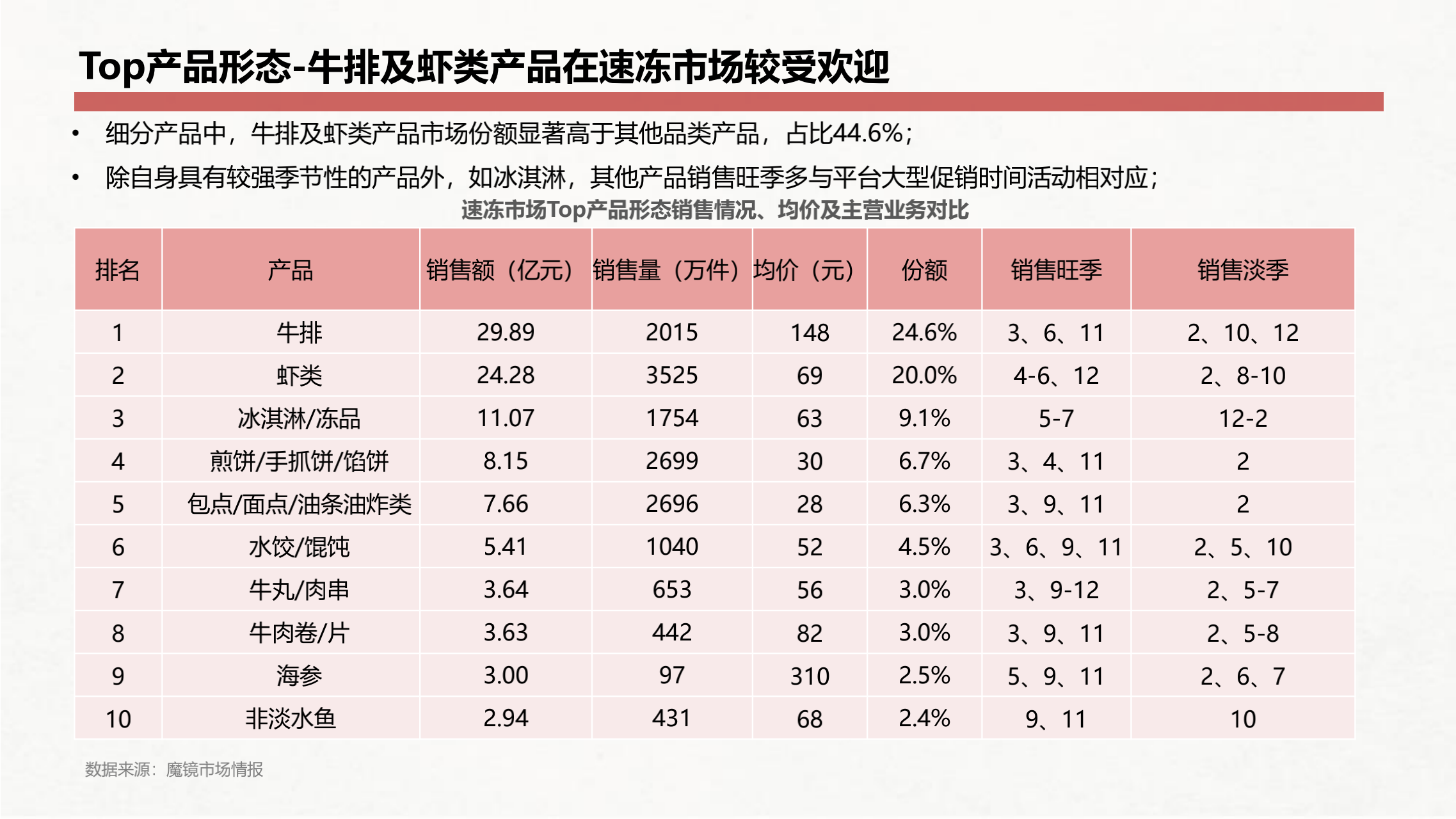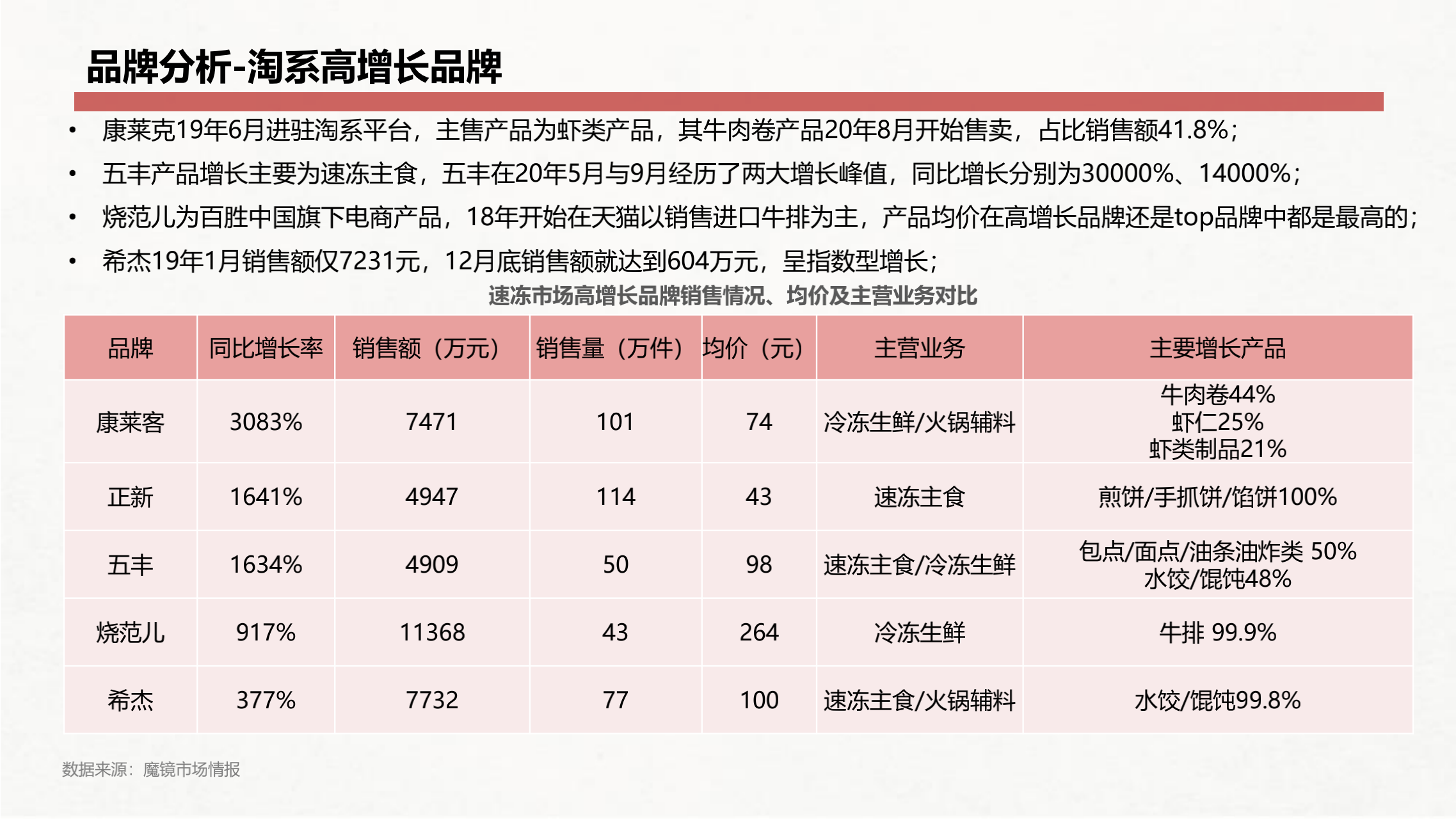 - 淘宝与天猫平台各产品形态对于增长的贡献情况类似,冷冻生鲜与速冻主食对于整个市场增长贡献近80%;