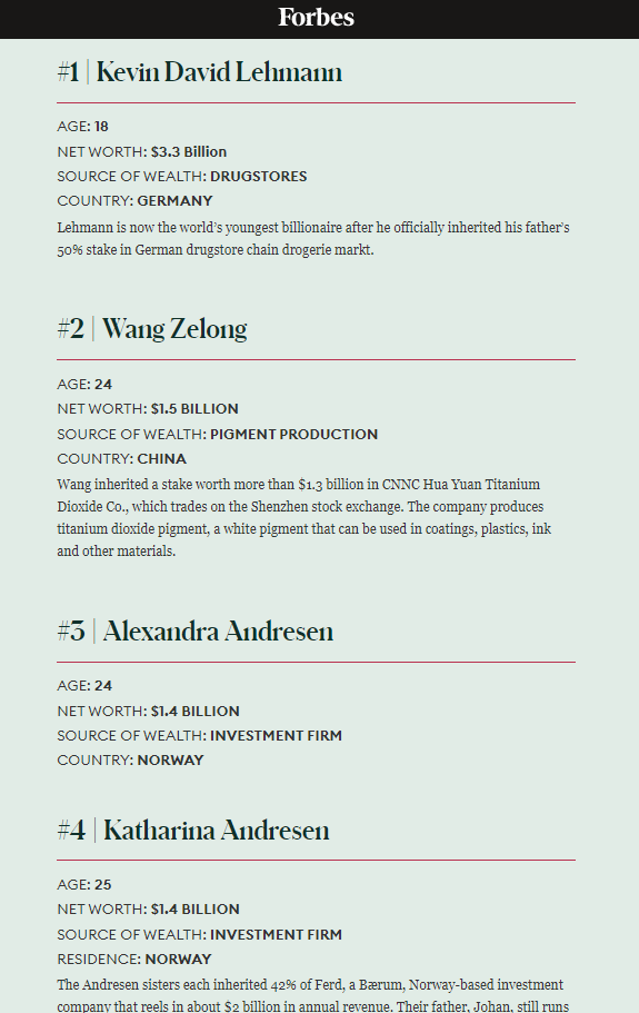 根据福布斯最新公布的2021年全球最年轻亿万富豪排行榜,共有十位30岁以下十亿美元级别的亿万富豪,总身家295亿美元,比2020年增加130亿美元。其中,18岁的德国小伙Kevin David Lehmann以33亿美元排第一。网友纷纷表示,别人家的18岁。