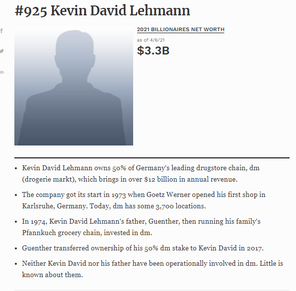 据了解,Lehmann从父亲那里继承了德国连锁药店dm-drogerie markt 50%的股权。该连锁店成立于1973年,业务范围覆盖了欧洲13个国家和地区。