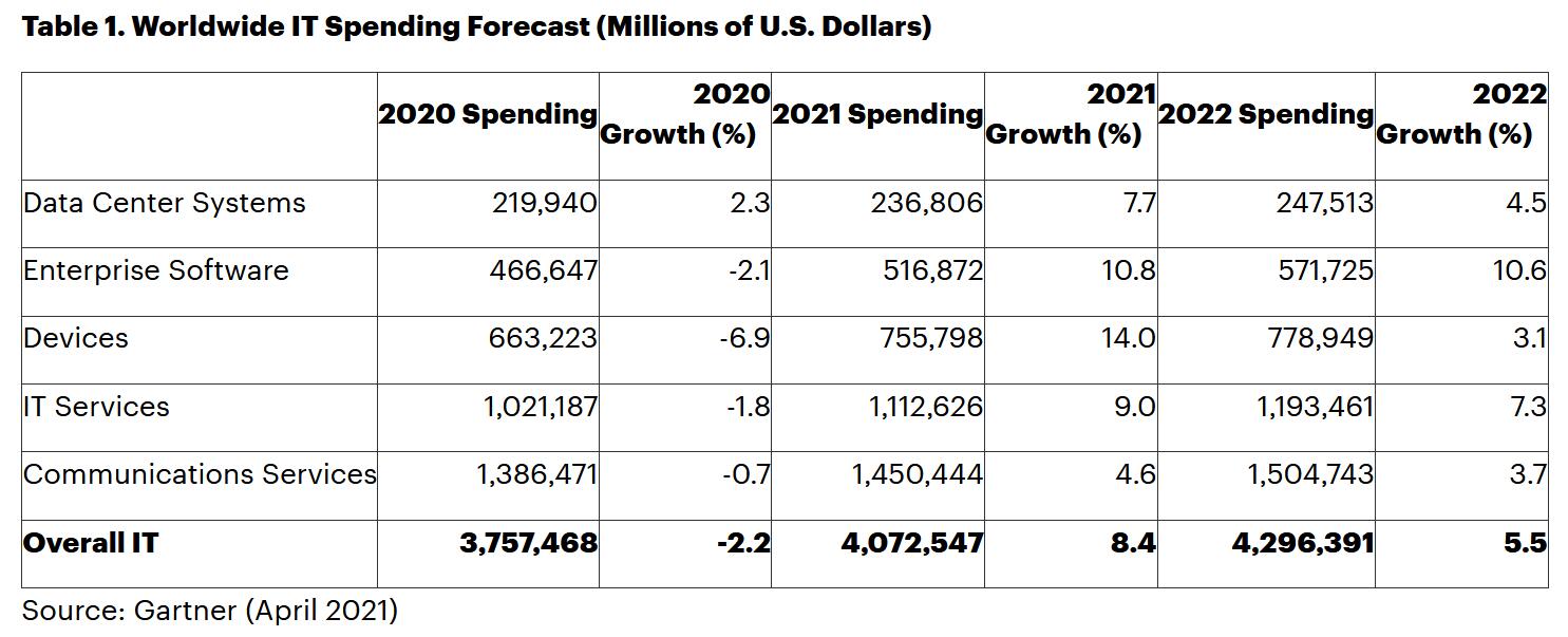 市场调查机构 Gartner 发布的最新预估报告,2021 年全球 IT 支出将达到 4.1 万亿美元,比 2020 年增长 8.4%。这一预测高于该公司在1月份估计的数据,当时该公司称全球 IT 支出将为 3.9 万亿美元,不到 4 万亿美元。