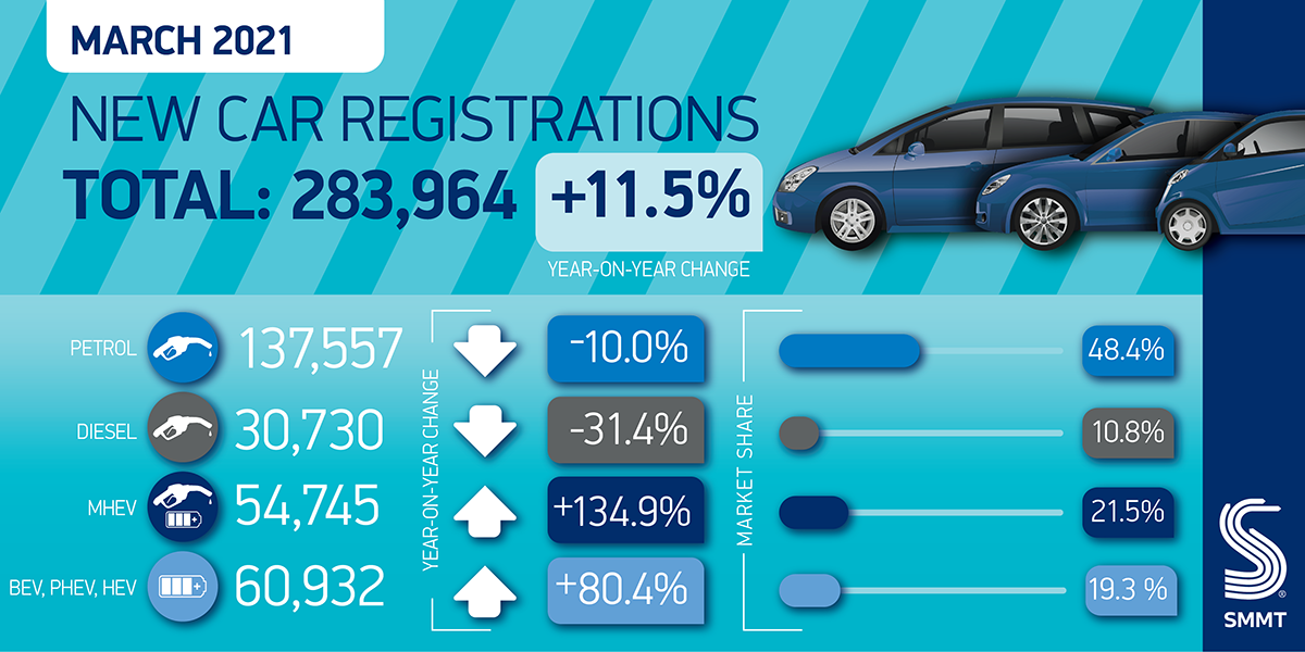 英国汽车制造商和贸易商协会(SMMT)公布的数据显示,英国新车市场自2020年8月以来首次实现“增长”,3月份登记的新车数量比去年同期增加了29280辆。
