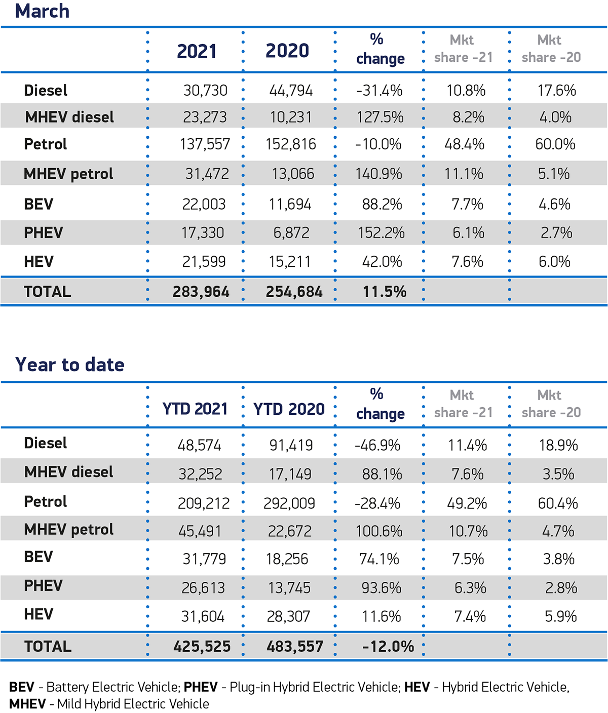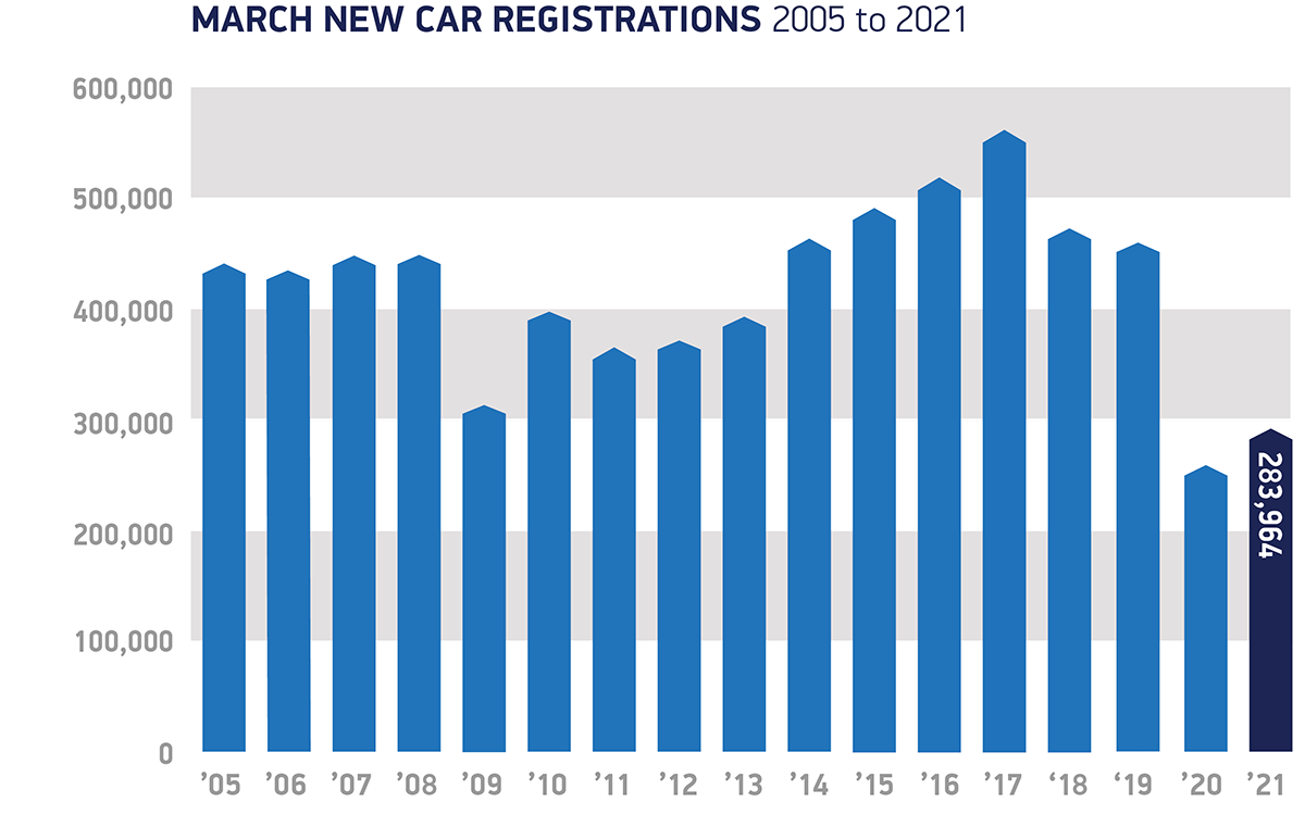 与2010-2019年3月平均销量450189量相比,登记量下降了36.9%,3月登记量为283964辆。到目前为止,与去年1月至3月相比,2021年第一季度汽车登记量减少了58032辆,相当于第一季度营业额损失18亿英镑。