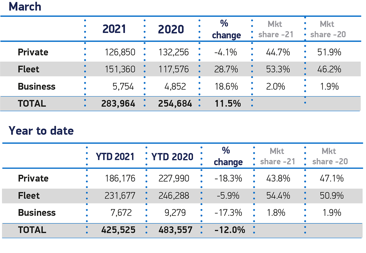 虽然总体登记数量与去年相比略有上升,但增长几乎完全来自车队,登记量增长了28.7%。零售消费需求仍然低迷,与2020年3月相比缩减了4.1%。