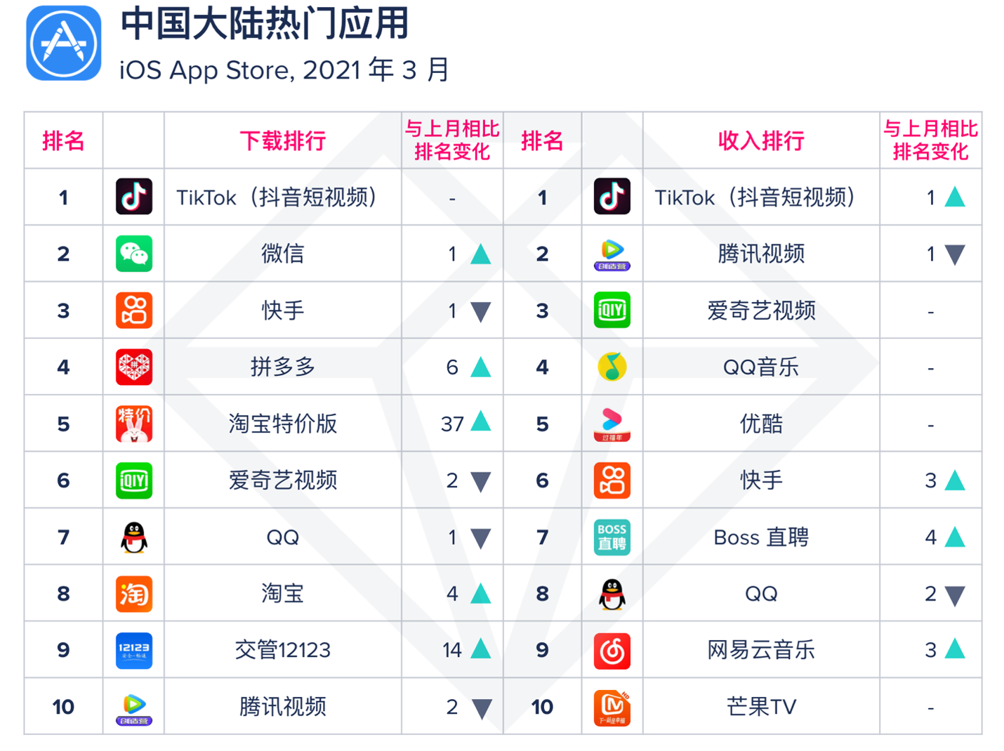 中国 iOS 应用下载榜前 10 名中,《淘宝特价版》本月增长 37 位,跃升至第 5 名,这是一款主打省钱、体积小、速度快的特价购物 App。另一款下载增速高的是《交管 12123》,上升 14 名,来到第 9 位,下载量环比增长 28%。收入排行榜中,《BOSS 直聘》在金三银四的跳槽高峰期中迎来一波增长,排名上升至第 7。