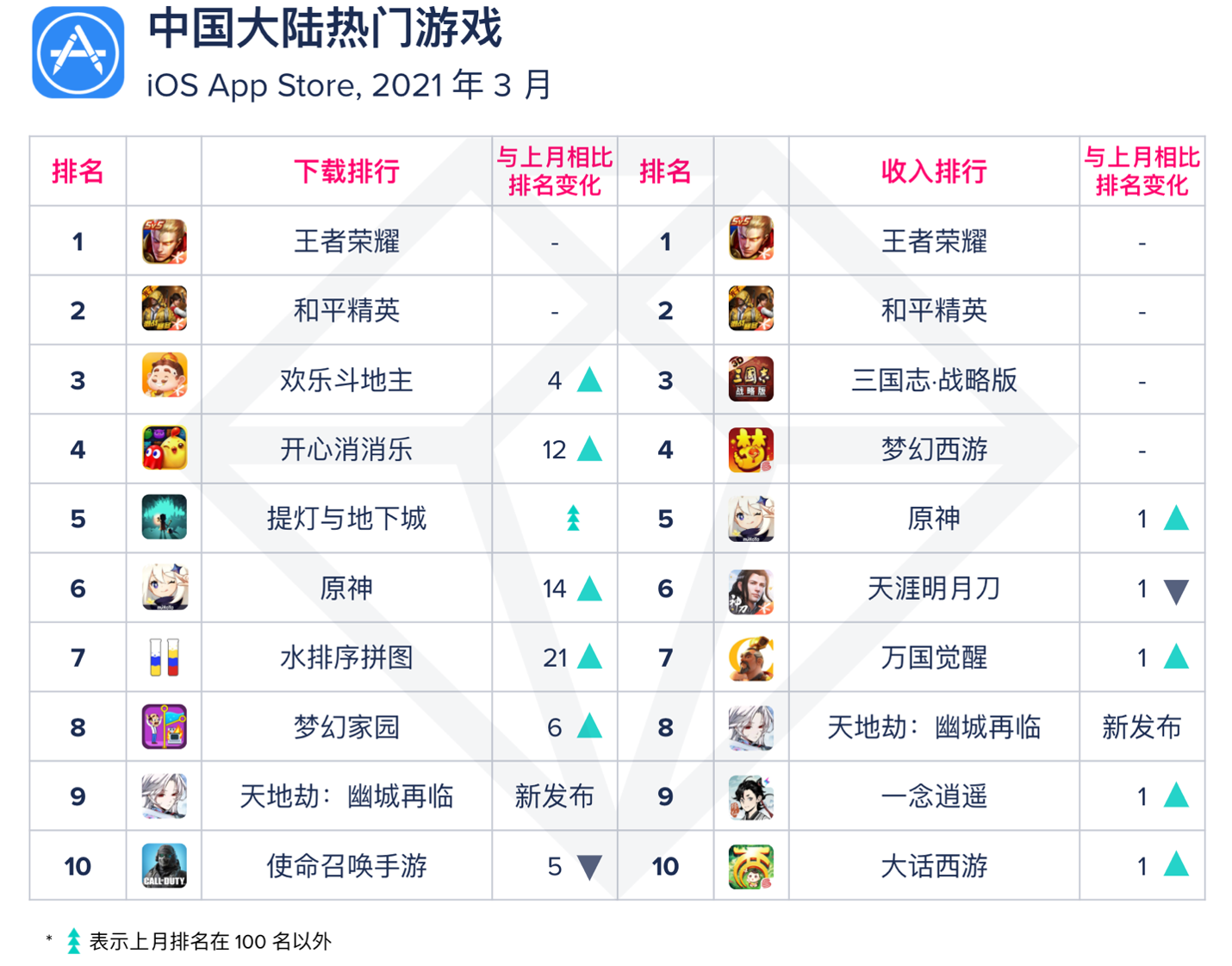 3 月中国游戏下载榜前 10 名变动较大。位列第 5 名的是青瓷的《提灯与地下城》,这是一款竖版地牢 Roguelike 游戏,并融入独特的“灯芯亮度调节”玩法,为玩家带来舒适的刷刷刷体验。另外,紫龙游戏的《天地劫:幽城再临》,重新塑造经典武侠 IP,勾起无数玩家情怀,自 3 月 10 日上线即空降中国游戏下载榜冠军,并且霸榜近一周,同时在畅销榜最高来到第 3 名。其余两款偏休闲益智类的《开心消消乐》及《水排序拼图》,本月下载排名皆大幅提升。收入榜前 10 名变化不大,新进榜的为《天地劫:幽城再临》。