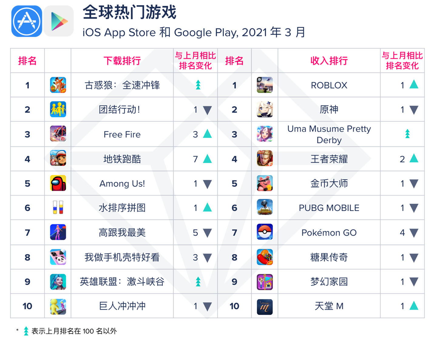 3 月全球游戏下载榜前 10 名中,强势登顶的是由以发行消除类游戏见长的英国厂商 King 推出的《古惑狼:全速冲锋》,在全球 100 多个国家的游戏下载总榜都位列前 5 名(iOS 版)。上线四天即突破 2100 万下载量,超越以往所有跑酷游戏。