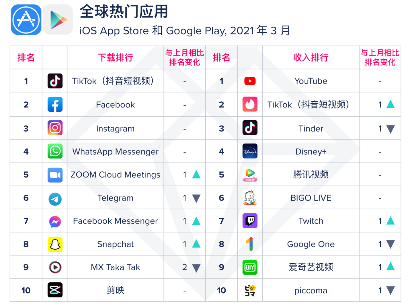 - TikTok稳居全球应用下载榜一,全球收入榜同比变化不大