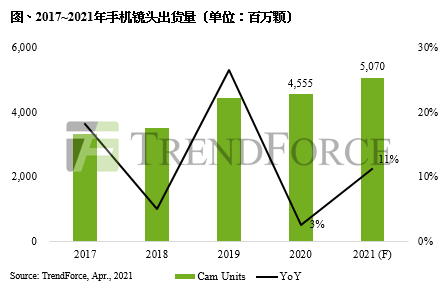 根据TrendForce集邦咨询研究显示,近年智能手机拍摄功能已然成为消费者选购手机的重点之一,故众品牌厂陆续推出多镜头产品,以期提升消费者购买意愿,并在已饱和的市场中争取更多市占,进一步大幅推升手机镜头的出货量。尽管2020年智能手机市场表现受疫情冲击,但在品牌厂的硬件规格战下,镜头搭载数量持续增加,去年整体出货年成长率仍有3%。预期此波成长动能将持续至2021年,手机镜头出货量有望达50.7亿颗,年成长率11%。