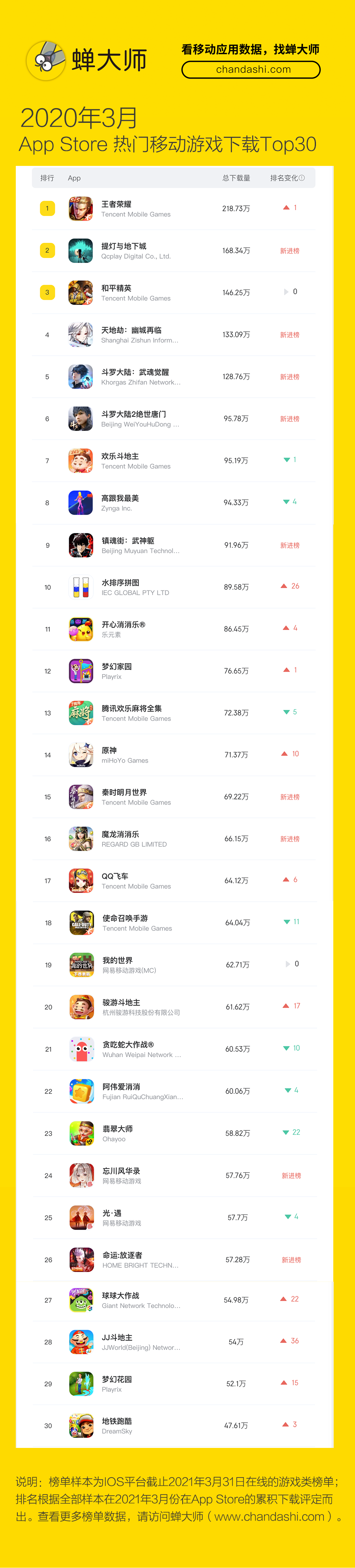 从游戏下载榜Top30来看,3月份的游戏市场竞争异常激烈。不仅有多款新游戏挤进榜单,取得不错的排名成绩。也有《翡翠大师》跌下神坛,从上月的冠军泯然众人矣。对比之下,腾讯旗下的《王者荣耀》则继续展现它强大的实力,在3月份成功夺回了下载榜第一的宝座。