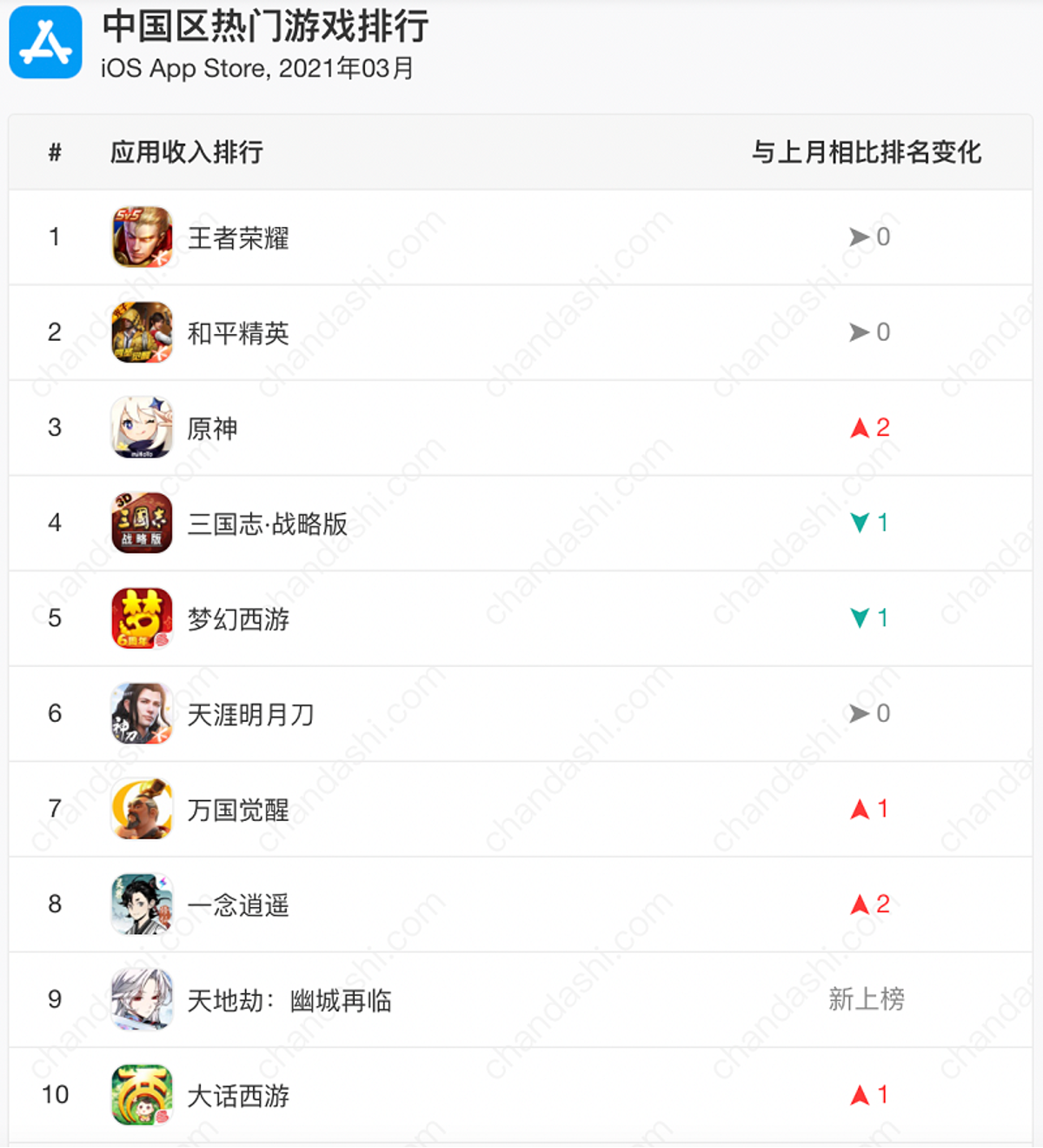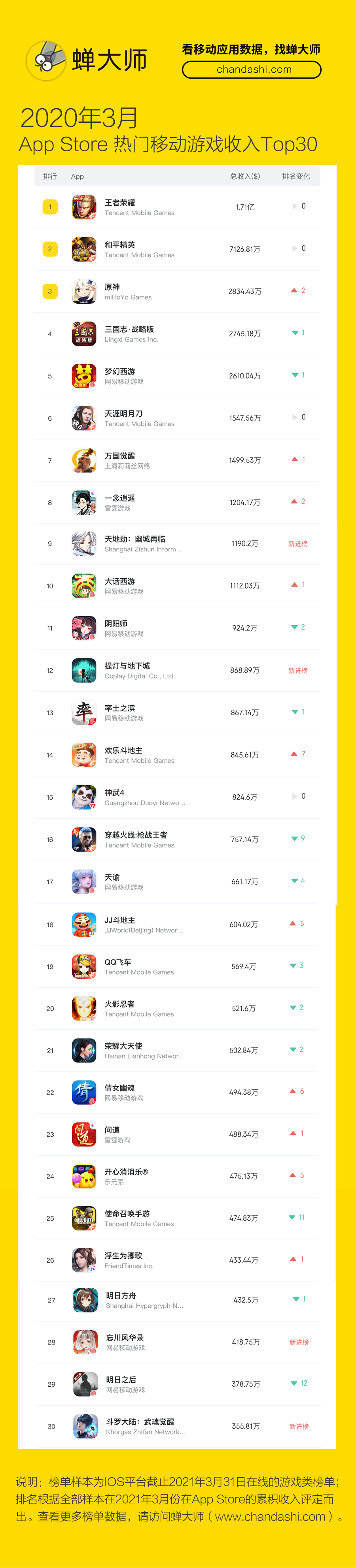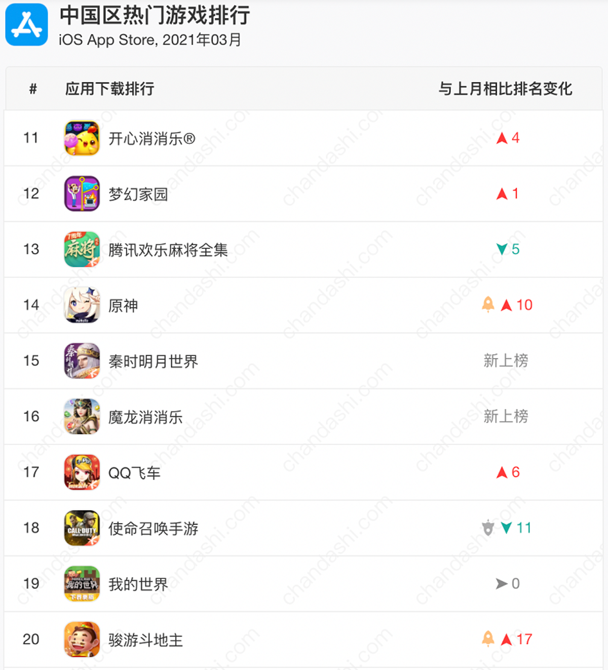 另外在Top10—20的榜单中,《原神》与《骏游斗地主》这两款游戏表现不俗,均相比较2月份排名有了大幅提升。不过有人欢喜就有人愁,《腾讯欢乐麻将全集》、《使命召唤手游》这两款腾讯旗下的游戏则排名下跌,双双从榜单Top10中跌出。