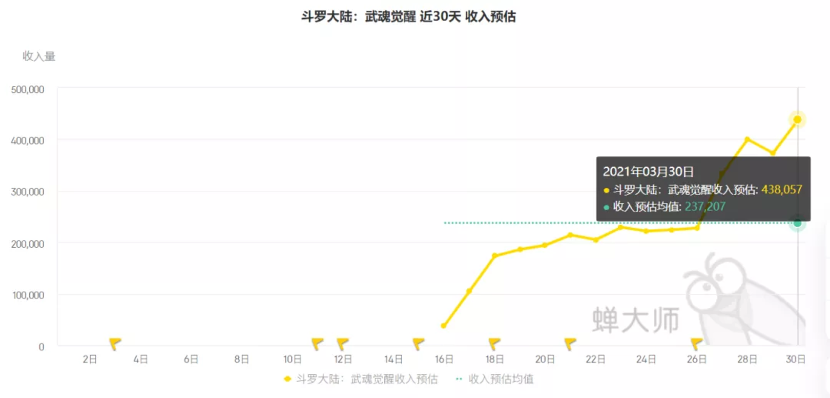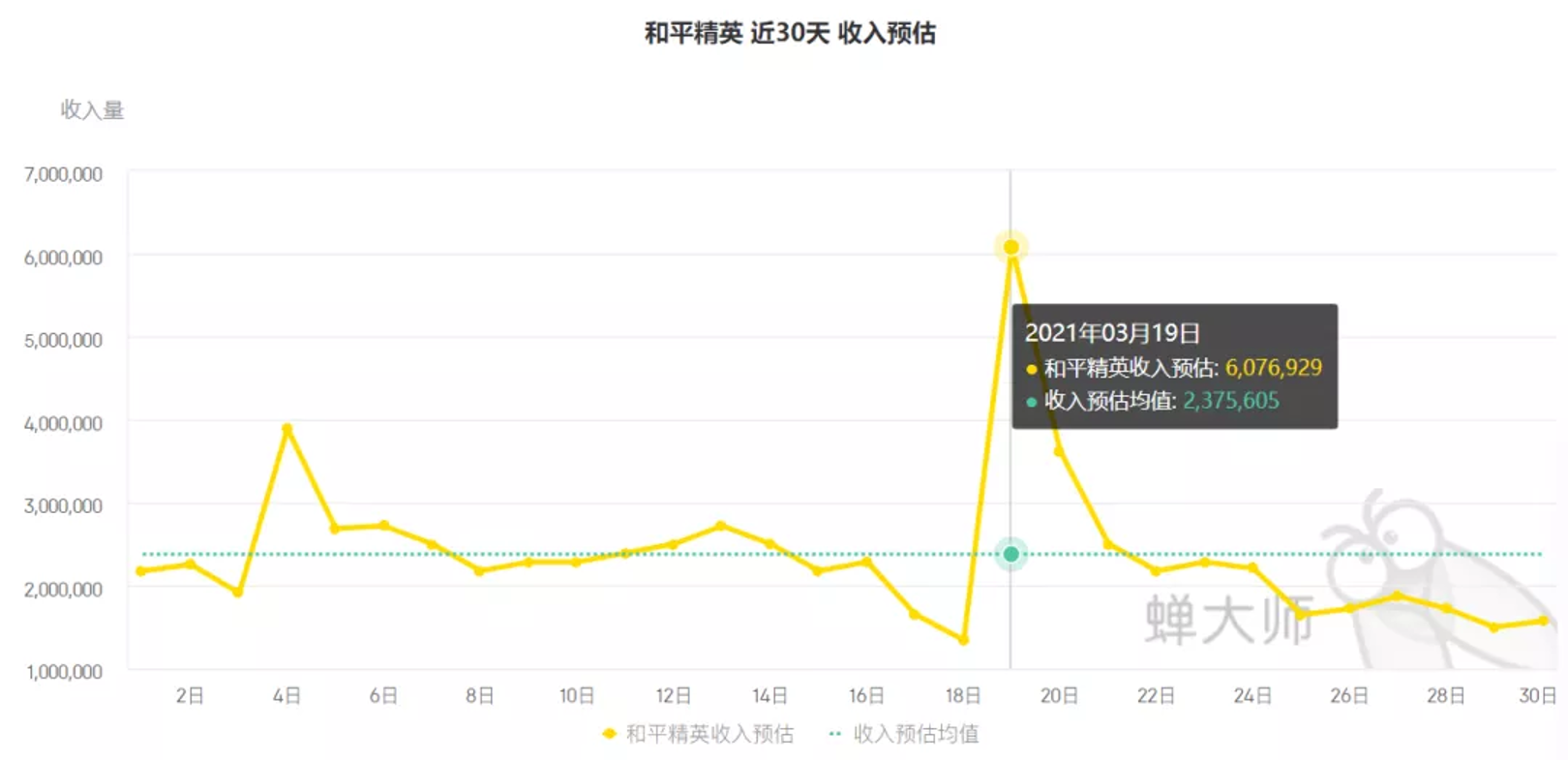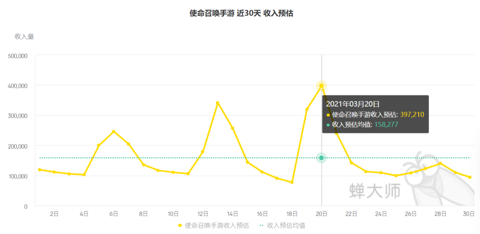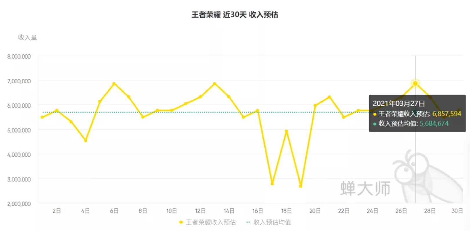 根据蝉大师的“收入预估”功能显示,《王者荣耀》、《和平精英》这两款游戏3月份的日均收入分别约为568万美元和237万美元。凭借如此高的收入表现,这两款游戏牢牢霸占了榜单Top1、Top2的位置。