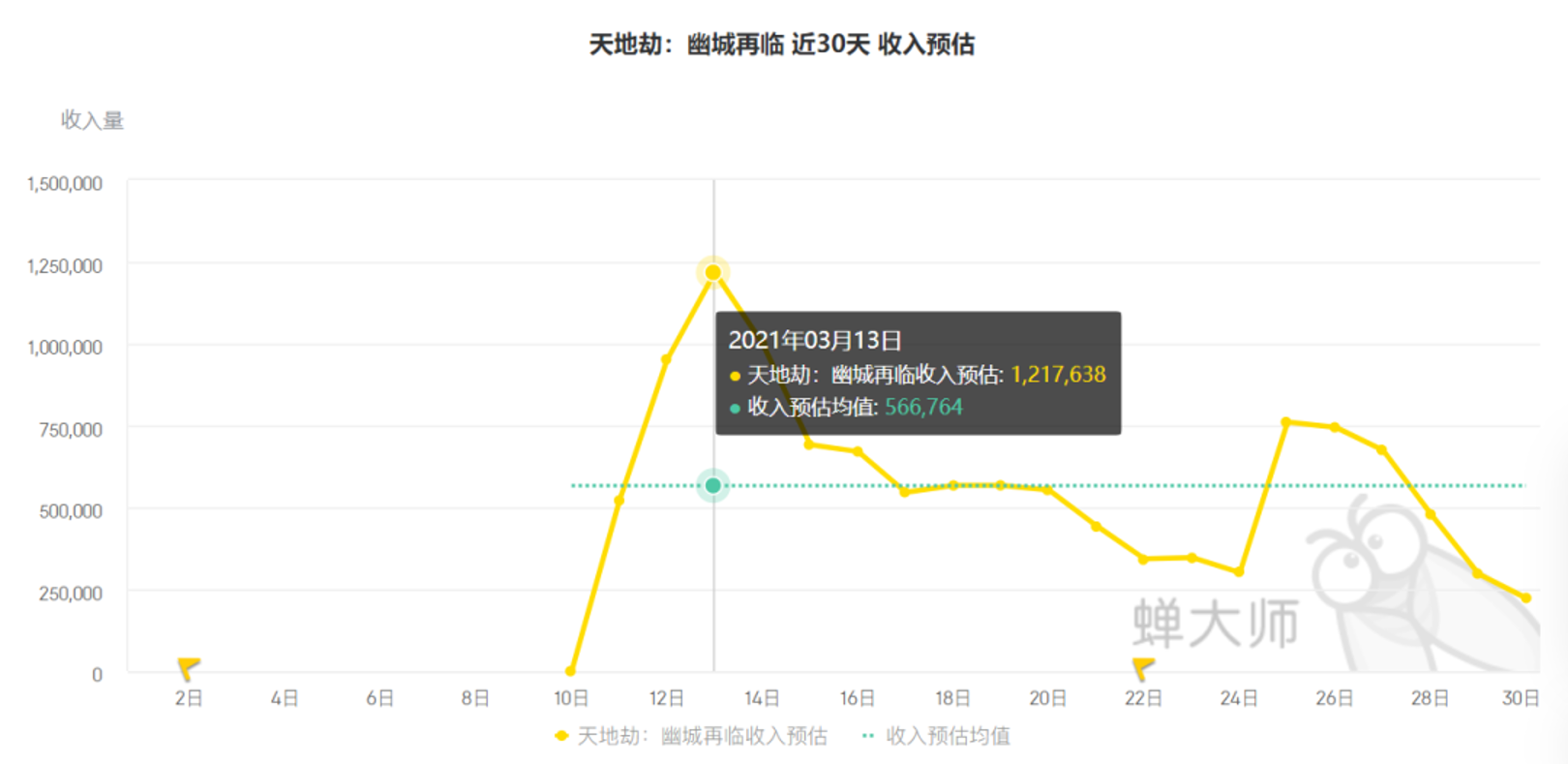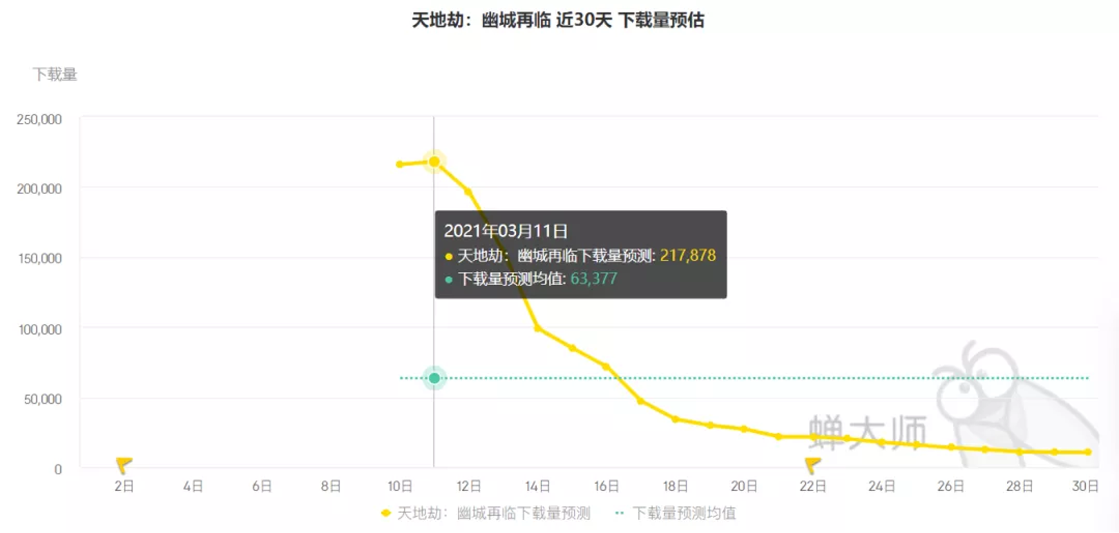 另外一款由紫龙游戏研发的IP手游新作《天地劫:幽城再临》也值得大家关注。根据蝉大师数据显示,该游戏于3月11日上线各大手机应用平台,上线当天就位列总榜(免费)Top2、游戏(免费)Top1的位置,人气表现非常不错。根据“下载量预估”功能显示,《天地劫:幽城再临》3月份下载量超过134万次,下载量峰值为3月11日的217878次。
