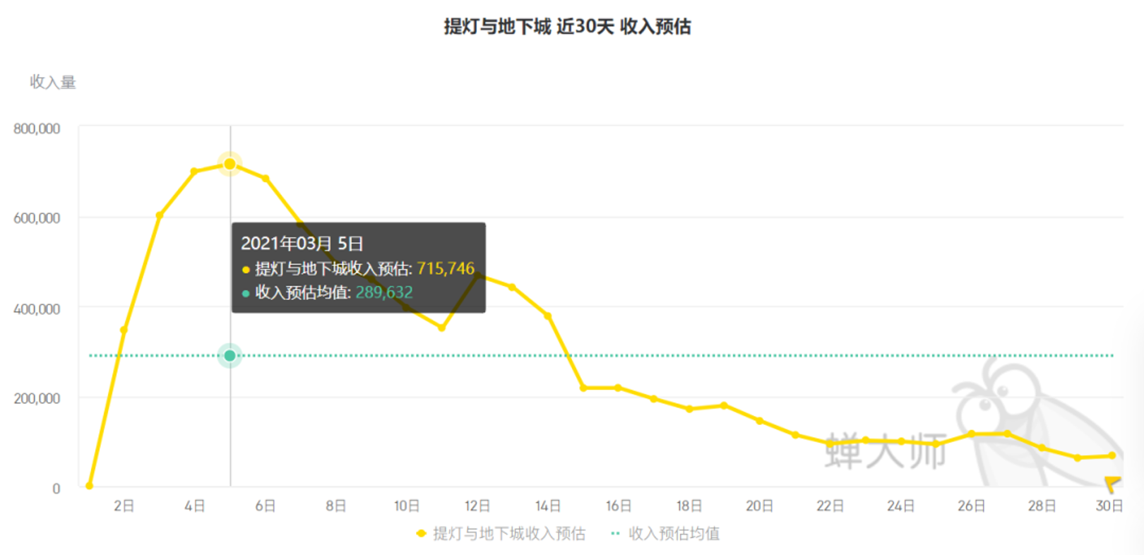 在3月份的游戏收入Top10—20的榜单中,《提灯与地下城》成唯一上榜新游。根据“收入预估”功能显示,该游戏近30天的日均收入为29万美元。但跟它的下载量一样,游戏的收入也呈现出高开低走的趋势,近7天的日均收入已将为9.1万美元。