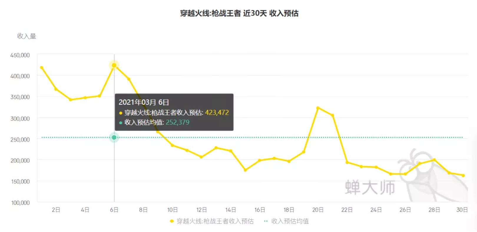 另外,表现差强人意的游戏当属腾讯旗下游戏《穿越火线:枪战王者》,根据“收入预估”功能显示,该游戏近30天的日均收入为25.2万美元,相比较2月份有明显下滑,在榜单上的排名下跌9位。跌出了Top10。