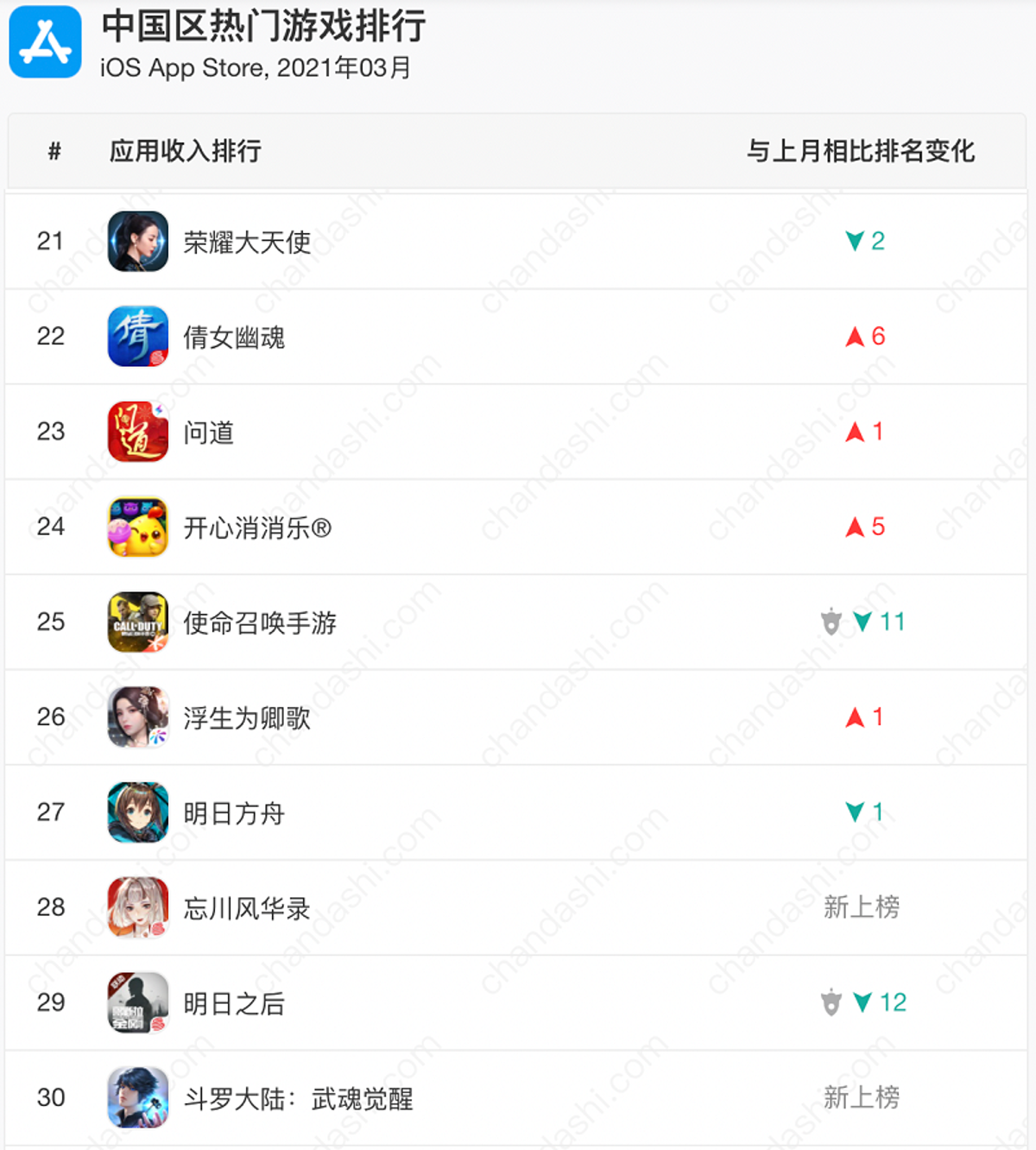 再看3月份游戏下载量Top20—30的榜单,网易旗下的《光·遇》依然在列,不知是喜还是忧。