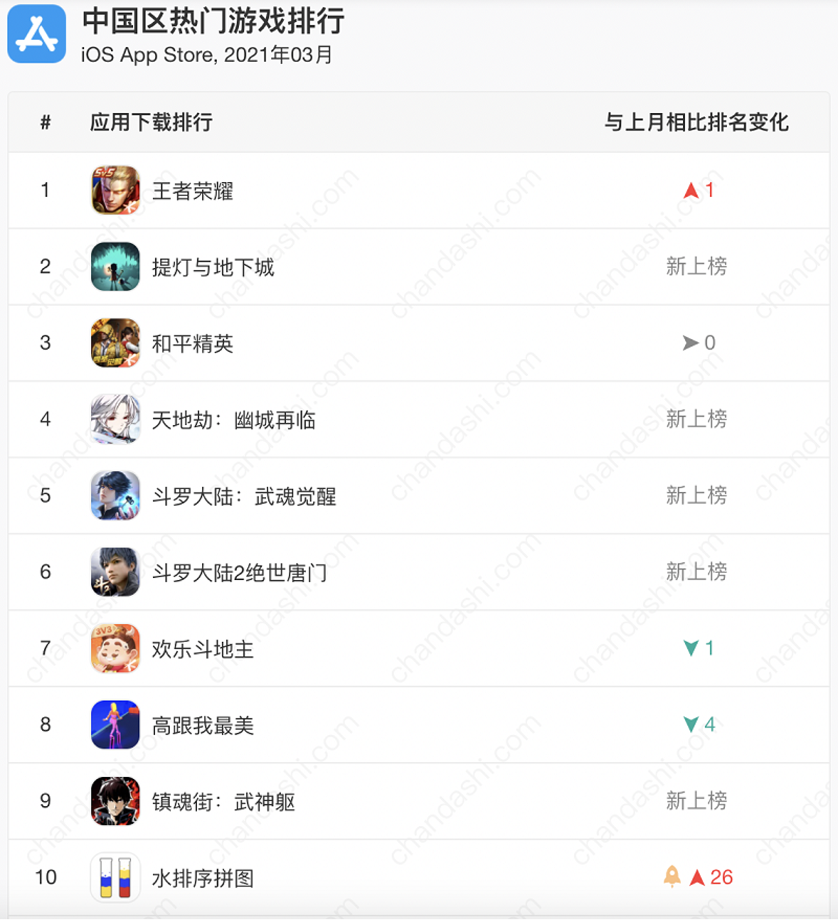 根据蝉大师的“月度指数”功能显示,在App Store3月份的游戏下载量Top10中,有5款新上榜的游戏,这项数据和2月份持平。它们分别是Top2的《提灯与地下城》、Top4的《天地劫:幽城再临》、Top5的《斗罗大陆:武魂觉醒》、Top6的《斗罗大陆2绝世唐门》以及Top9的《镇魂街:武神躯》。