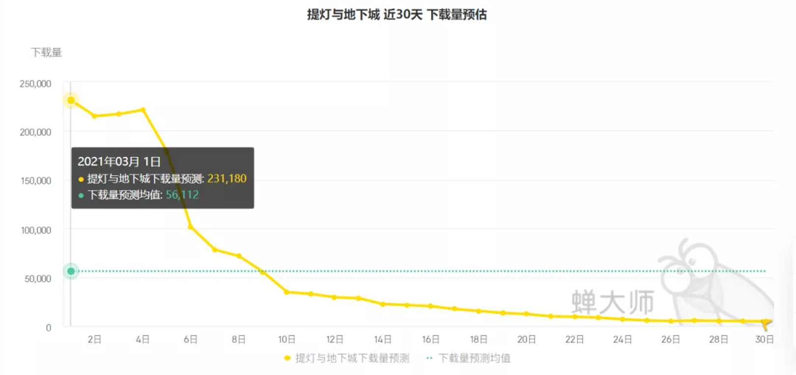 根据蝉大师数据显示,《提灯与地下城》的排名呈现出高开低走的趋势。虽然一上线就挤进App Store总榜(免费)的前两名,但现如今已快跌出前一千名。不过相比较总榜上的暴跌趋势,《提灯与地下城》在各个游戏榜单上的下滑趋势相对平稳,至今依然能够保持在冒险游戏(畅销)榜前十。另根据蝉大师“下载量预估”功能显示,《提灯与地下城》3月份下载量约为169万次,近30天的日均下载量为5.6万/天。