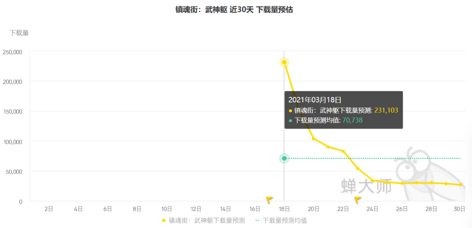 基于原作的强大热度,《镇魂街:武神躯》上线前就全平台预约数达近千万。而后得益于产品高品质、以及明星体验等一系列创新营销组合拳,让游戏首发当日便登上了免费榜第一。据快手官方海报显示,游戏上线首日新增用户已破百万。而根据蝉大师的“下载量预估”功能显示,《镇魂街:武神躯》的下载量峰值为3月18日的23万次,此后就开始走下坡路。