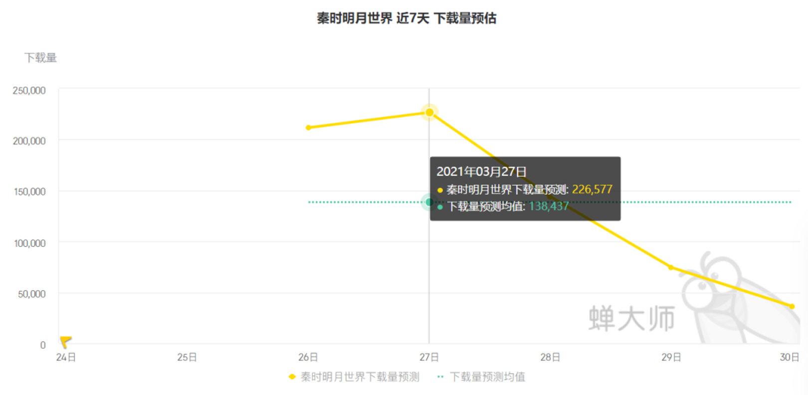 其中《秦时明月世界》是3月26日才上架App Store的,短短几天就成功挤进榜单实属不易。根据蝉大师的“下载量预估”功能显示,《秦时明月世界》上线至今的日均下载量为13.8万次/天。