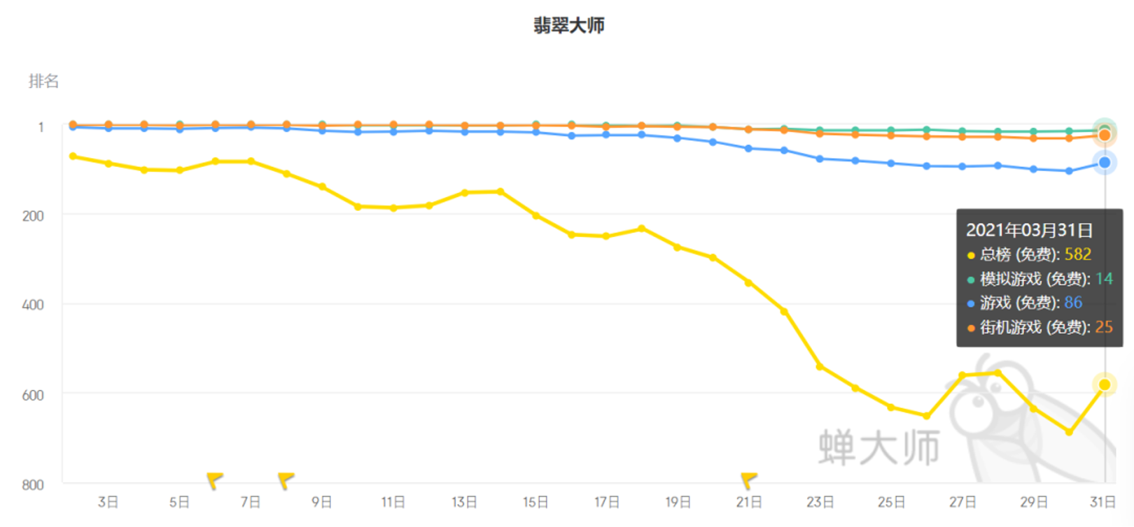 《翡翠大师》则排名暴跌22名,从2月份的冠军变成了3月的Top23。随着大家恢复了正常工作、上课的状态,空闲时间大大减少,让超休闲游戏对于新用户的吸引力逐渐变低,可以看出该游戏已呈现出明显“疲态”。