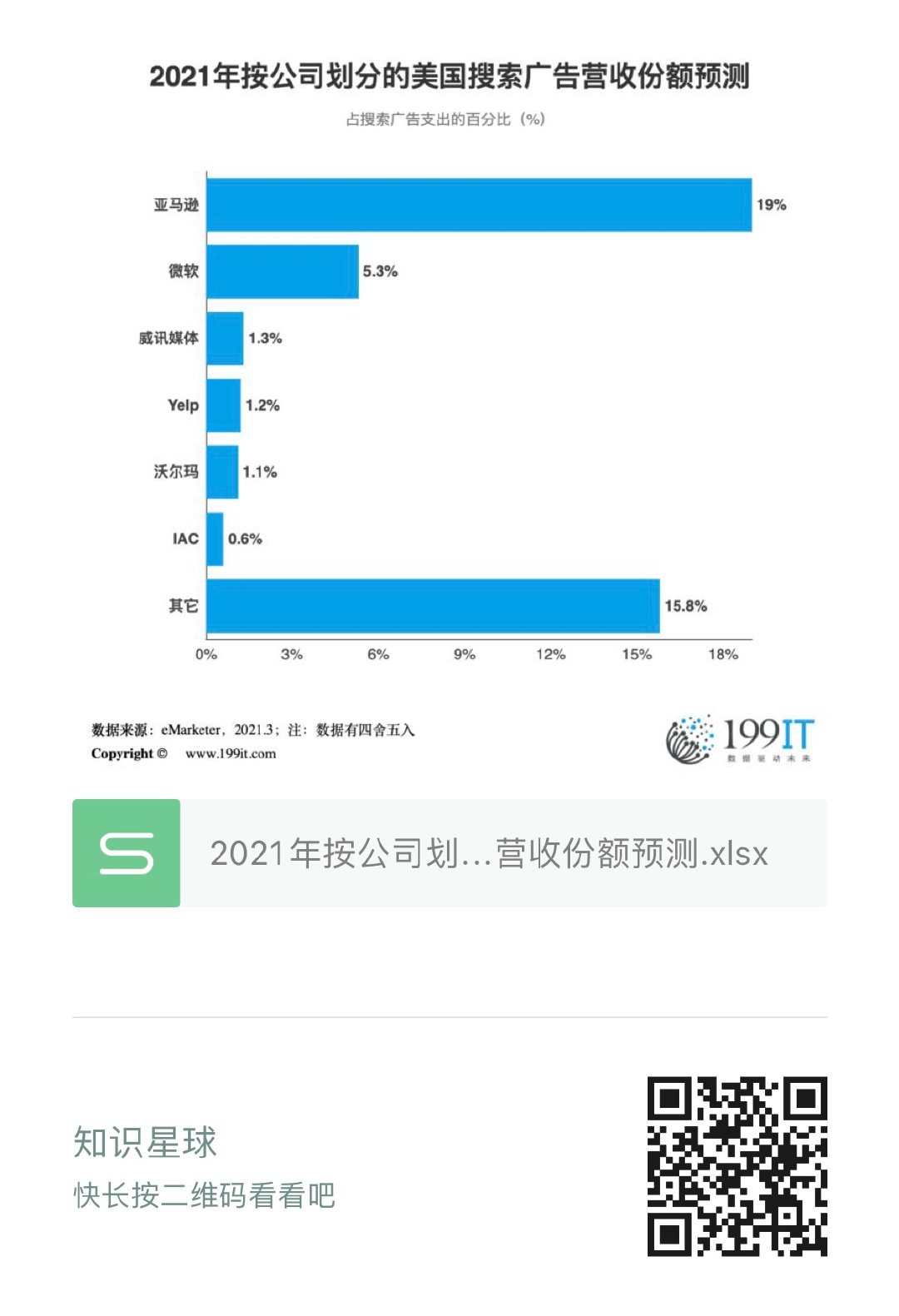 2021年按公司划分的美国搜索广告营收份额预测(附原数据表) 更多阅读:eMarketer:新加坡的移动终端占据更多的付费搜索点击量IgnitionOne:2012年Q2美国搜索及移动搜索广告报告信息图:Google每天赚1亿美元的秘密IAB:2015年上半年美国广告收入调查报告IgnitionOne:移动驱动全球搜索广告增长Mediapost :2013年全球移动广告达193亿美元Adobe:2014年Q2搜索广告报告显示美国搜索广告支出上升9% 谷歌每点击成本上升4%MediaPost:预计2014年美国广告市场达到1494亿美元 飙升6.2%【深度解读】App Store搜索广告Adthena:付费搜索报告:旅游行业Adthena:2018年金融行业品牌搜索报告Marin Software:2018年Q1全球搜索广告支出增长11%eMarketer:谷歌产品列表广告的效果如何?eMarketer:预计2020年美国搜索广告支出达559亿美元 同比增长5.9%WordStream:COVID-19导致7个行业搜索广告指标提高