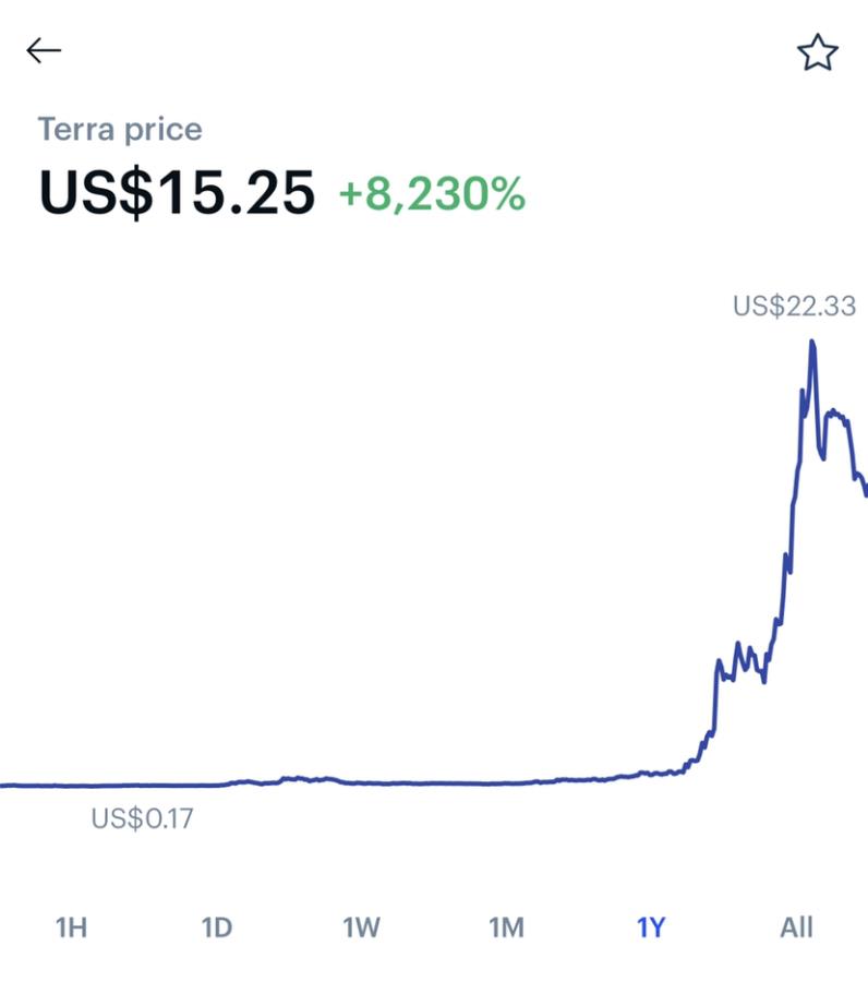 年初LUNA的交易价格为0.655美元,4月12日为14.91美元,涨幅超2000%。