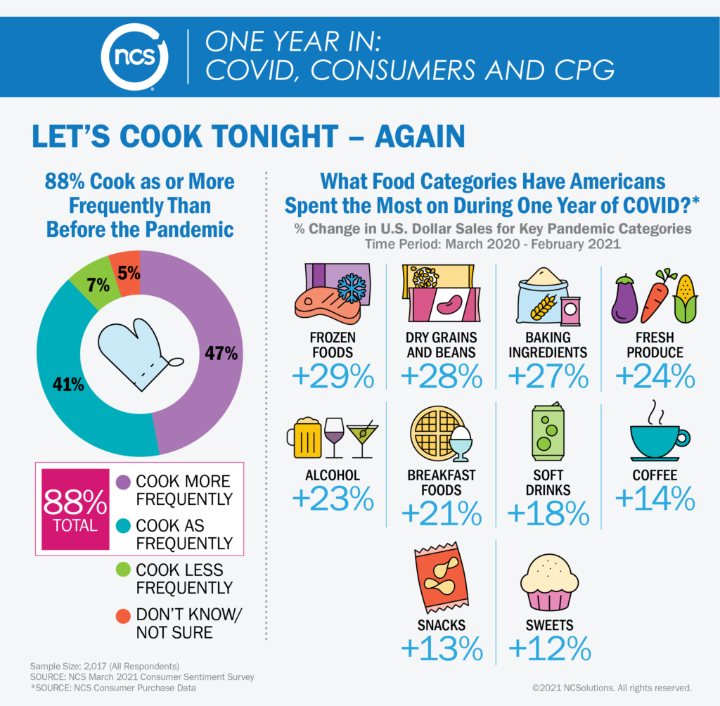 根据NCSOLUTIONS(NCS)最新的消费者调查和购买数据,美国食品和杂货店的购物模式在一年内已经发生了变化。自从新冠大流行以来,96%的美国人和平时一样多或花更多时间进行家庭清洁和消毒; 47%的人吃得更健康,一半的美国人更愿意做饭吃;近1/7的人将看电视作为一种自我保健和消遣的方式。