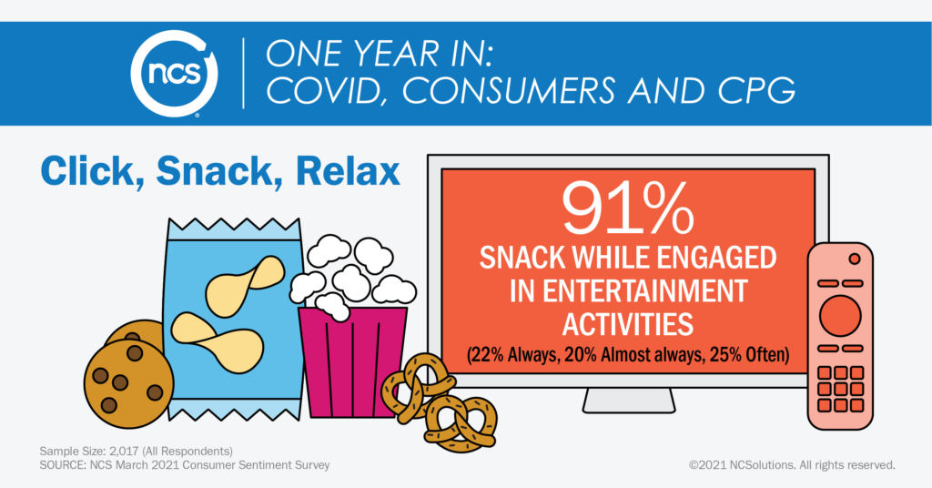 91%的美国人表示他们边看电视边吃零食,67%的受访者说他们一边吃零食一边进行家庭娱乐活动。
