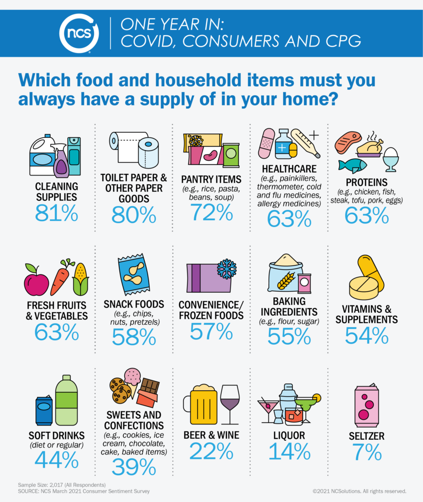 美国前十大食品和家庭用品中,清洁用品(81%)排名第一。但是,其他6项与管理身体和情绪健康有关的项目也被认为是必要的,包括止痛药、温度计等保健用品(63%);鸡肉、鱼、蛋等蛋白质(63%);新鲜水果蔬菜(63%);快餐类(58%);烘焙用品(55%);维生素和补充剂(54%)。