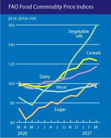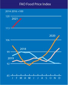 粮农组织食品价格指数(FFPI)在2021年3月的平均值为118.5点,比2月高2.4点(2.1%)。这是自2014年6月以来FFPI连续第十个月上升至最高水平。