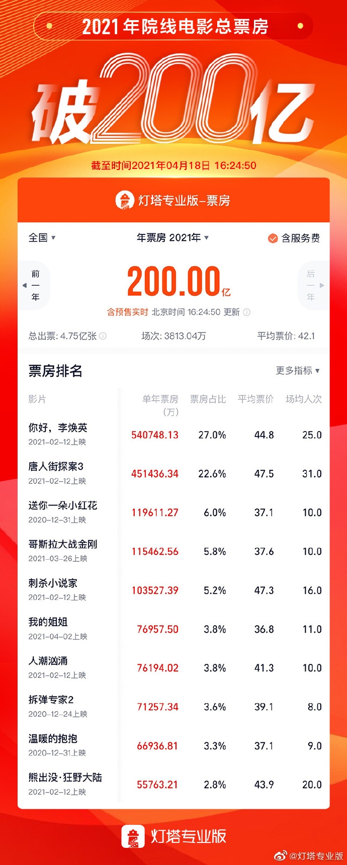 据灯塔实时数据,截至4月18日下午16时24分,中国电影市场2021年度总票房(含预售)突破200亿元,总观影人次达 4.75亿,总场次3813.04万。其中,《你好,李焕英》破50亿,《唐人街探案3》破40亿,另有《送你一朵小红花》、《哥斯拉大战金刚》、《刺杀小说家》三部电影破10亿。