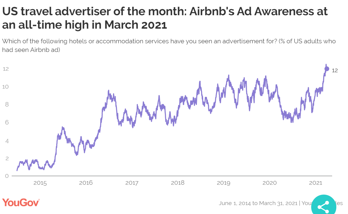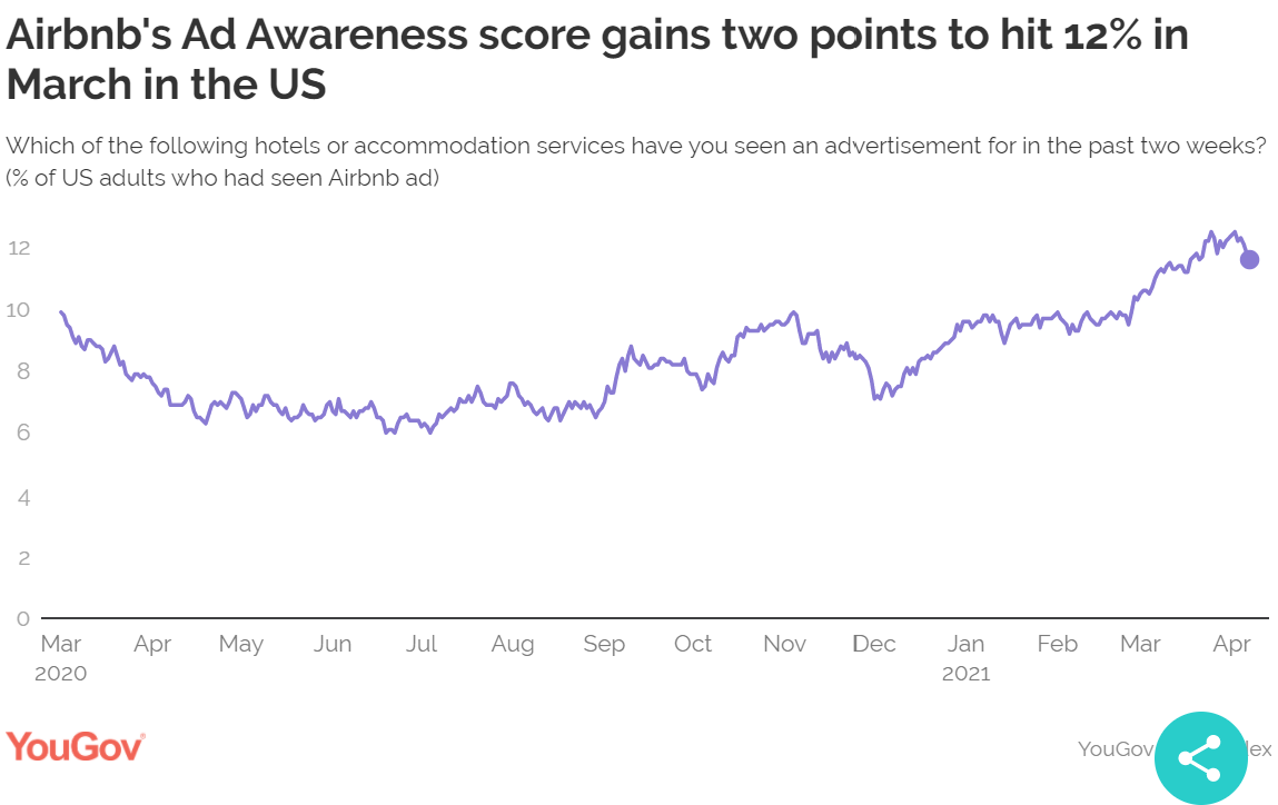 根据YouGov的数据,住宿业巨头Airbnb在3月份美国消费者中的认知度得分从10.5%上升到12.3%。YouGov的品牌指数有助于跟踪品牌在一系列消费者中认知整体表现。