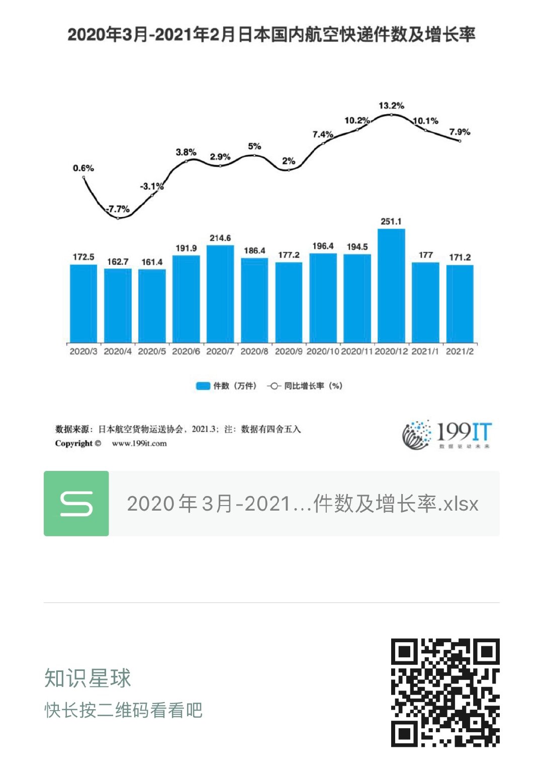 2020年3月-2021年2月日本国内航空快递件数及增长率(附原数据表) ​​​​
