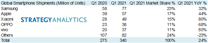 统计机构Strategy Analytics公布了2021年第一季度的全球手机出货量报告。数据显示,当季全球智能机出货3.4亿部,同比增加24%,创下2015年来的新高。关于其中原因,机构认为得益于健康的需求势头和中国厂商在5G方面的大力推动。