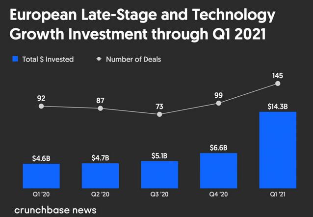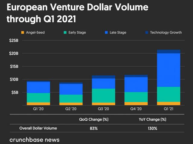 第一季度欧洲初创企业共获得214亿美元风险投资,同比增长一倍多,比2020年最后一个季度增长近一倍。各个阶段的投资都有所增加,其中后期投资增长最快。