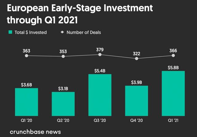 欧洲初创企业的早期投资交易额为58亿美元,也创下了历史新高,同比增长62%,环比增长49%。