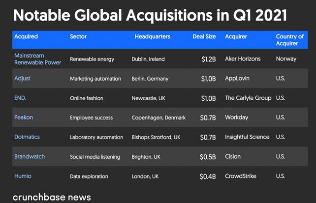 第一季度总部位于柏林的营销自动化公司Adjust被总部位于美国的AppLovin以10亿美元收购,总部位于哥本哈根的求职平台Peakon被总部位于美国的Workday以7亿美元收购。