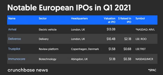 第一个季度,两家欧洲公司以超过100亿美元的估值上市,分别是电动汽车公司Arrival和Deliveroo。