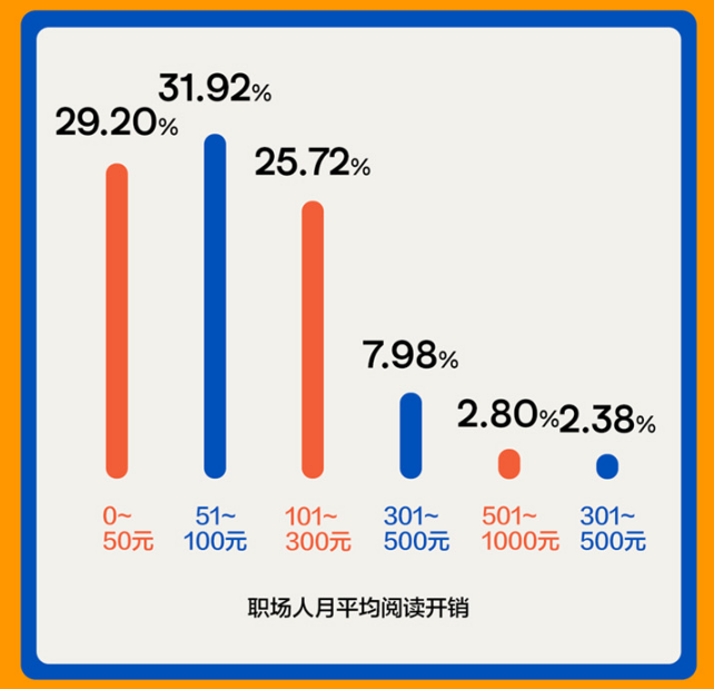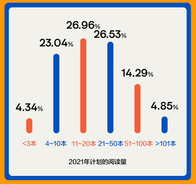 湛庐:2021年职场人阅读报告 现在就将这份由10000+份问卷,所分析得出的《2021年职场人阅读报告》交付给你,在知识与思想的氛围中,共同迎接“呼啸而来的未来”。 阅读量再+1,听书时长稳中上涨 调查显示,2021年职场人纸质书+电子书平均阅读量为19.54本,超过去年的18.75本。日拱一卒无有尽,终身学习给予了职场人“重塑”的勇气和行动能力。 超过43.32%的职场人每天听有声书超过30分钟,与去年的调查结果相比,该人群占比上升了近10%。咳咳,忍不住想问那些每天听书超过120分钟的职场人,你是在播客频道负责审听吗? 50元是底线,读书无需“仪式感” 超过70%的职场人,每月读书的开销超过50元。不过更值得点赞的是:月购书开销100-300元的人群,占比增加了约6%;月购书开销300-500元的人群,占比增加了约3%。买本好书,是最好的个人投资。 职场人偏爱(没有办法)选择的阅读场景依旧是:周末或假期、每天睡前、通勤路上。一个有趣的现象是,拥有博士学历的职场人尤其“排斥”去咖啡厅或图书馆进行阅读。或许对他们来说,自己就是一座移动的图书馆。 视频号成主入口,挑书就是挑内容 直播能带货,但带书不太行,调查显示仍有一半的职场人表示从来不看图书直播。因为与其他直播平台的内部布局有差异,以及最基础的朋友圈直播分享功能,微信视频号成为职场人收看图书直播的首选平台,尤其是北上广深的职场人。 会读书的职场人,都能独立思考。对于选书这件事,他们并不过分在意热闹的榜单,就算是“领导”推荐也只当做简单参考。内容题材、出版品牌/出版社、作者/译者,是职场人购书因素的“头部钉子户”。 愿为知识付费,把思考作为习惯 《经济学人》早就主张,不断更新技能是提高职业素养的关键。如何学?怎么学?学什么?知识付费平台可以帮助我们,在一定程度上解决选书难、收获少、难坚持等问题。有超过80%的职场人,购买过知识付费产品。 你最近读了几本书?超过45%的职场人,计划今年阅读超过20本书。面向未来的投资、能力、管理、视野、生活、教育,我们需要足够多的内容来完善自己的知识拼图。 更多阅读:猎聘:调查显示近六成职场人认为面试超过3-4轮就难以忍受前程无忧:2018职场人通勤调查职场人年终盘点,90/80/70满意度大不同脉脉:当代职场人婚恋大观热云数据:2018年8月移动阅读APP广告投放洞察全球传媒发展(2015)主要数据2022青岛女性阅读调查报告2021年度武汉大学图书馆阅读报告中国网民网络阅读形态观察:多样化破解“阅读过时”预言?App Annie:2013年11月移动平台应用下载及收入榜排行榜 16张图帮你读懂美国数字出版大数据解读上海市民阅读习惯Read it Later:不同设备用户上网时间统计分析RUNTO:2023年10月电子纸学习本线上销量达到了1.6万台 同比增长30倍以上2022年乡村小学阅读状况调查报告