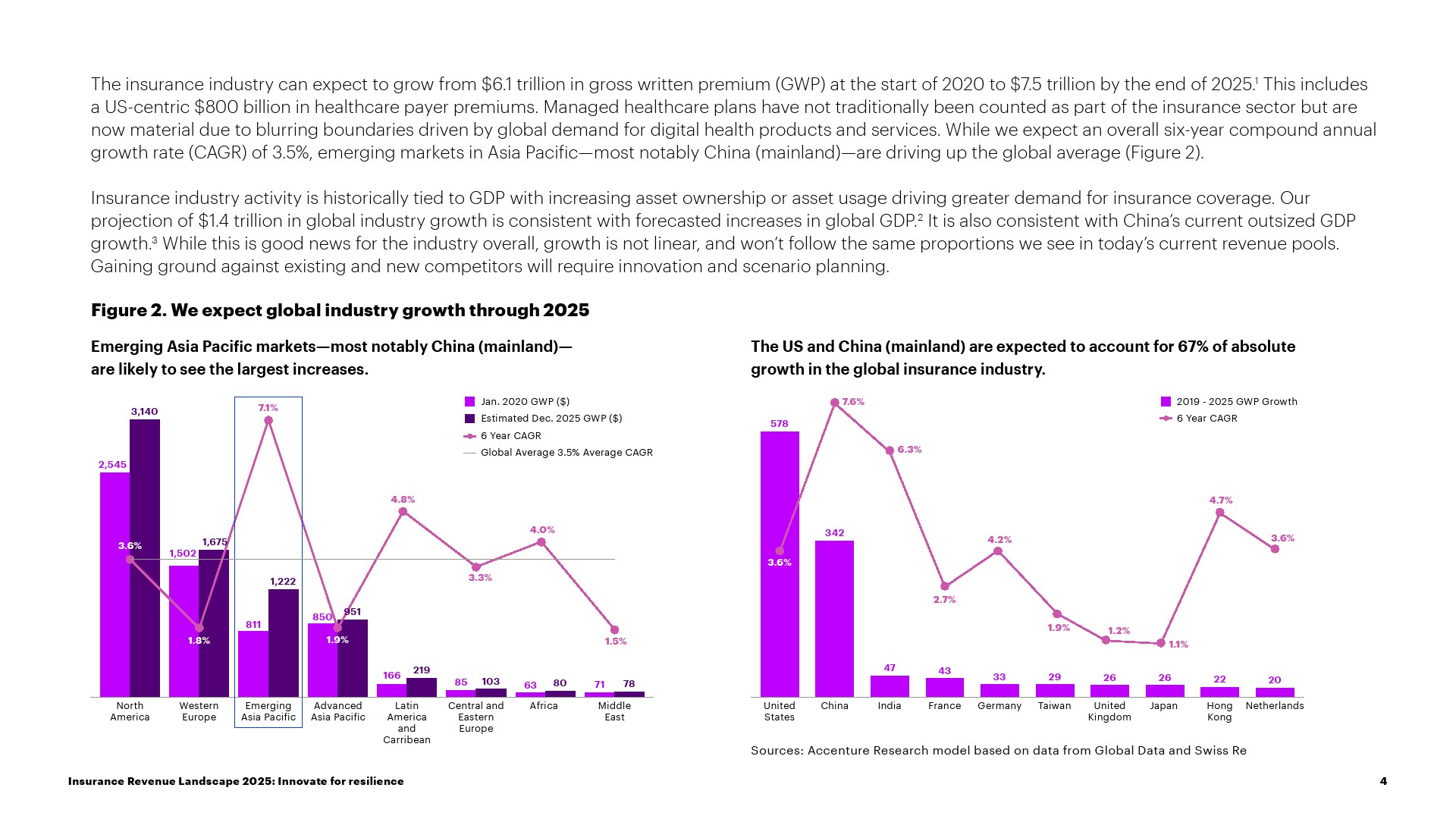 尽管2020年全球经济衰退,全球保险业仍从2020年初的6.1万亿美元增长到2025年底的7.5万亿美元,年复合增长率为3.5%。这包括8000亿美元以美国为中心的医疗保健保费。