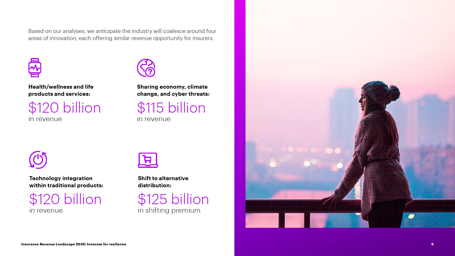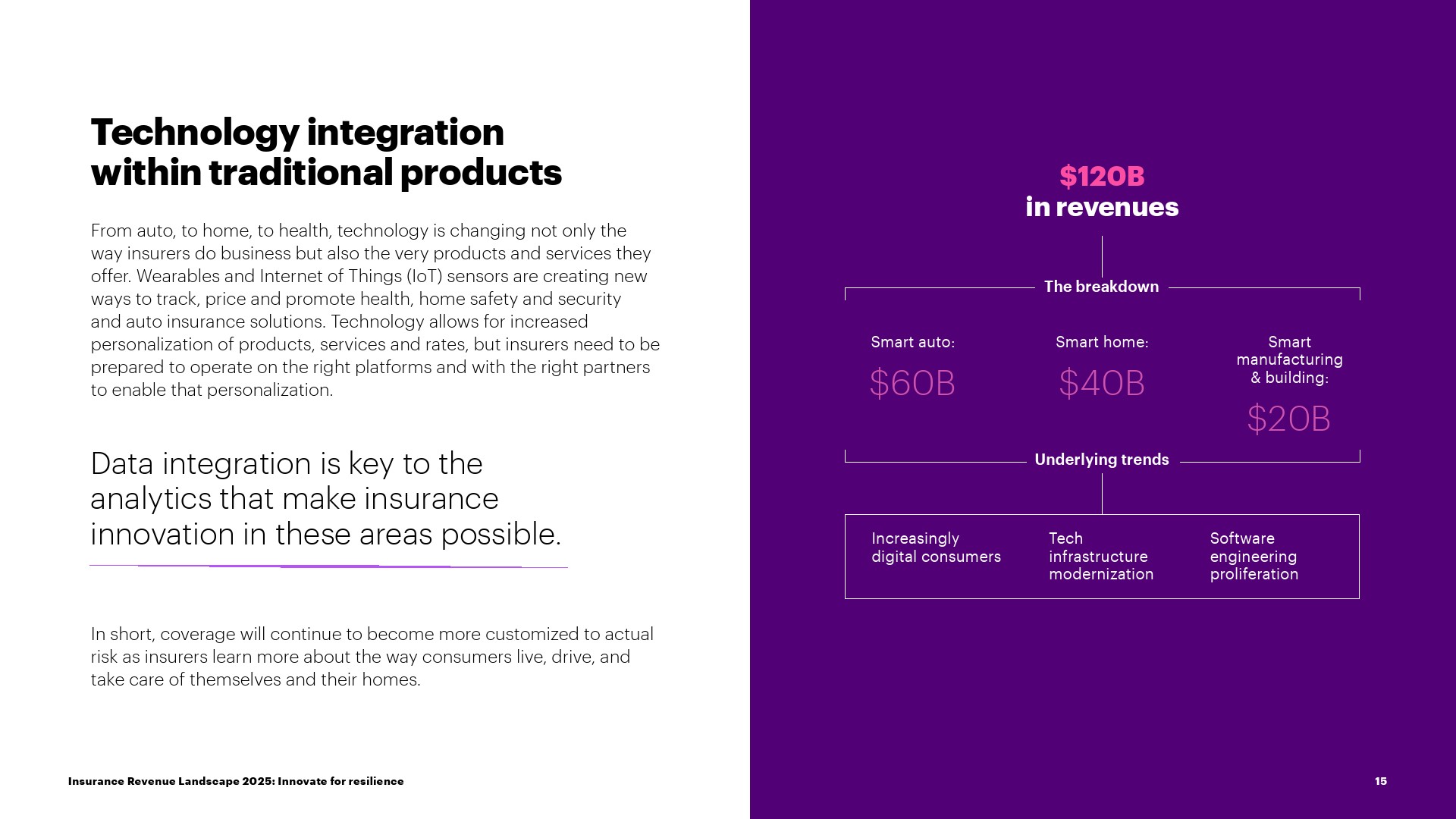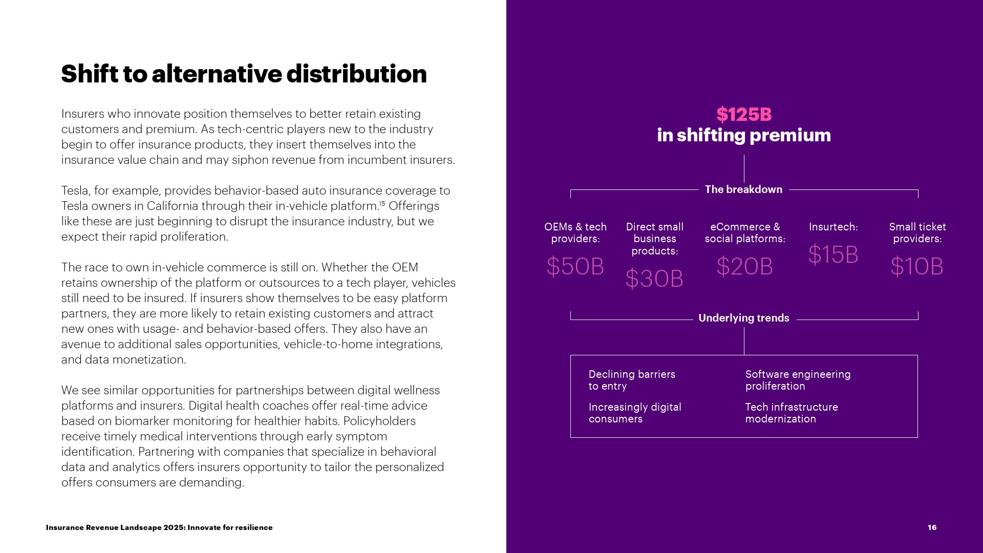 客户通过数据驱动的产品更新保单,目前1400亿美元的保险收入可能会从传统保险产品转向技术支持的保险产品,包括转向基于行为的互联车辆和智能家居保险。同时,当客户在数字渠道和第三方平台上购买保险时,提供数字发行经验的保险公司可能会取代传统保险发行中的另外1400亿美元收入。