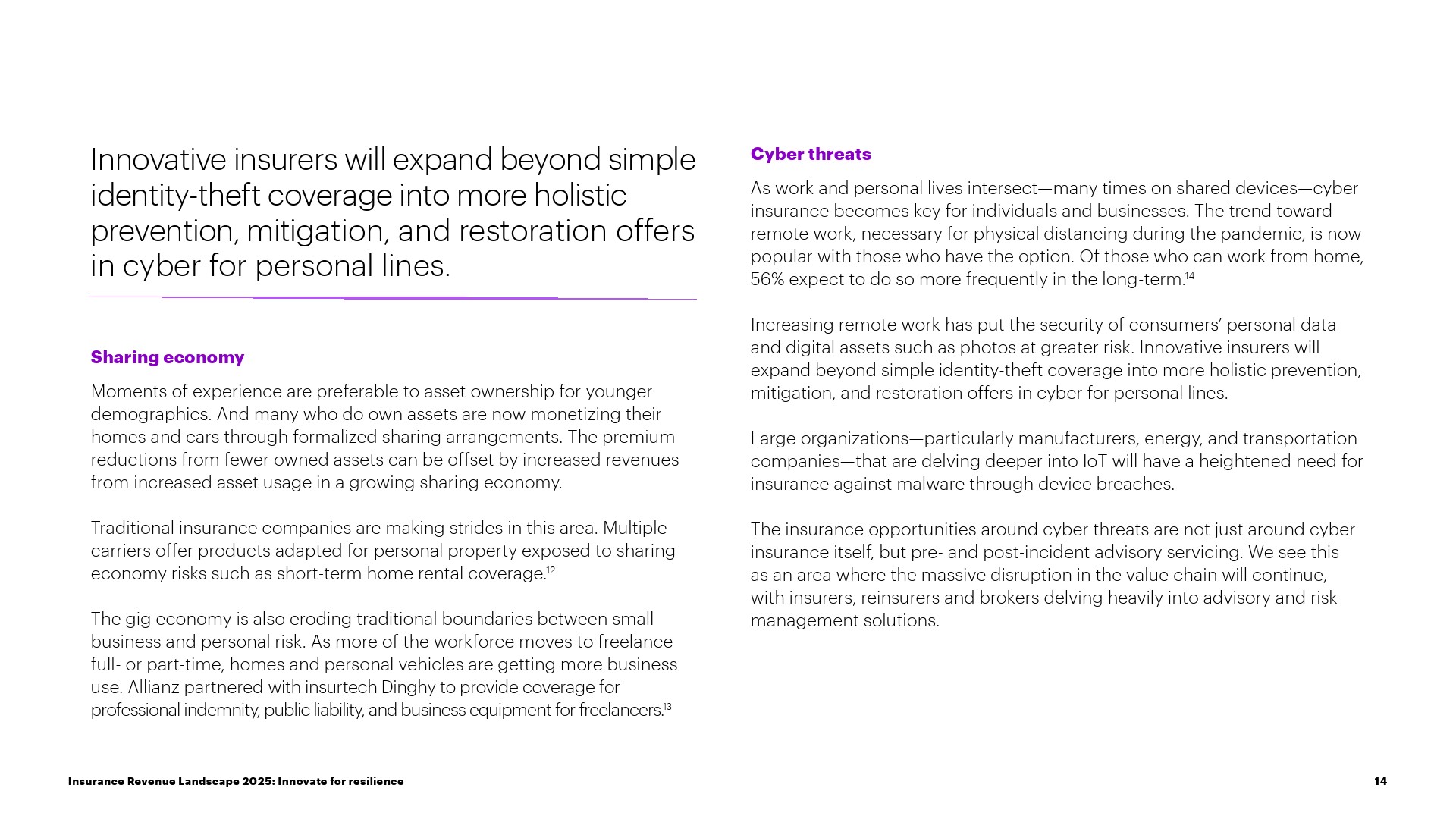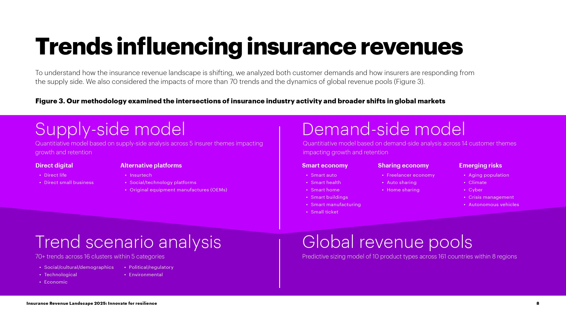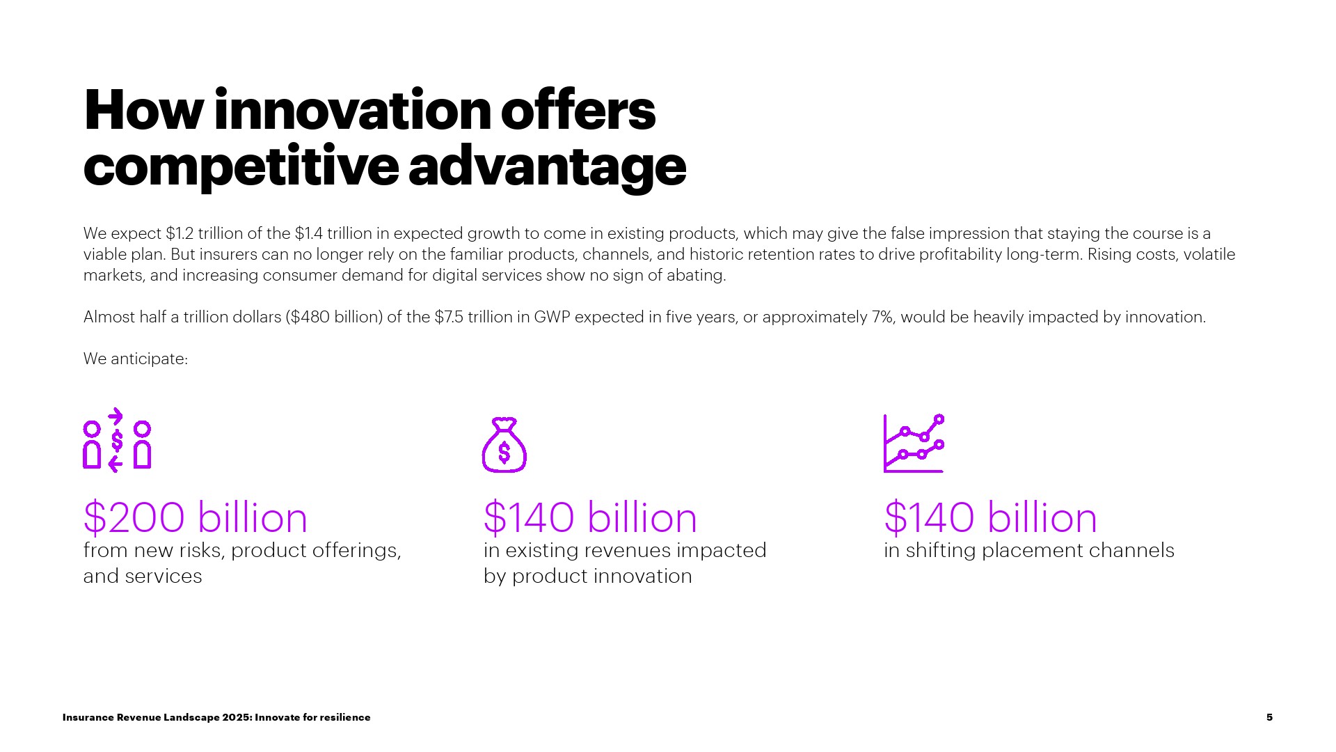 客户通过数据驱动的产品更新保单,目前1400亿美元的保险收入可能会从传统保险产品转向技术支持的保险产品,包括转向基于行为的互联车辆和智能家居保险。同时,当客户在数字渠道和第三方平台上购买保险时,提供数字发行经验的保险公司可能会取代传统保险发行中的另外1400亿美元收入。
