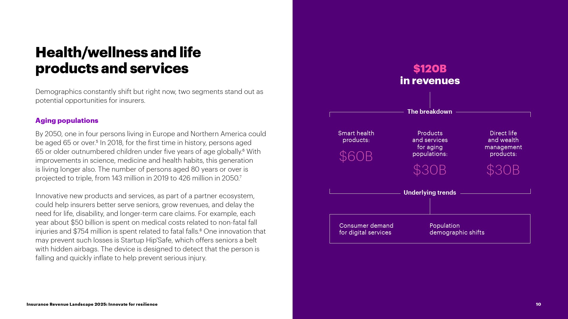 报告估计,人寿保险、健康和财富行业的融合将产生1200亿美元的新收入,其中600亿美元来自智能健康产品;为老龄化人口提供300亿美元产品和服务;以及300亿美元的直接生活和财富管理产品。