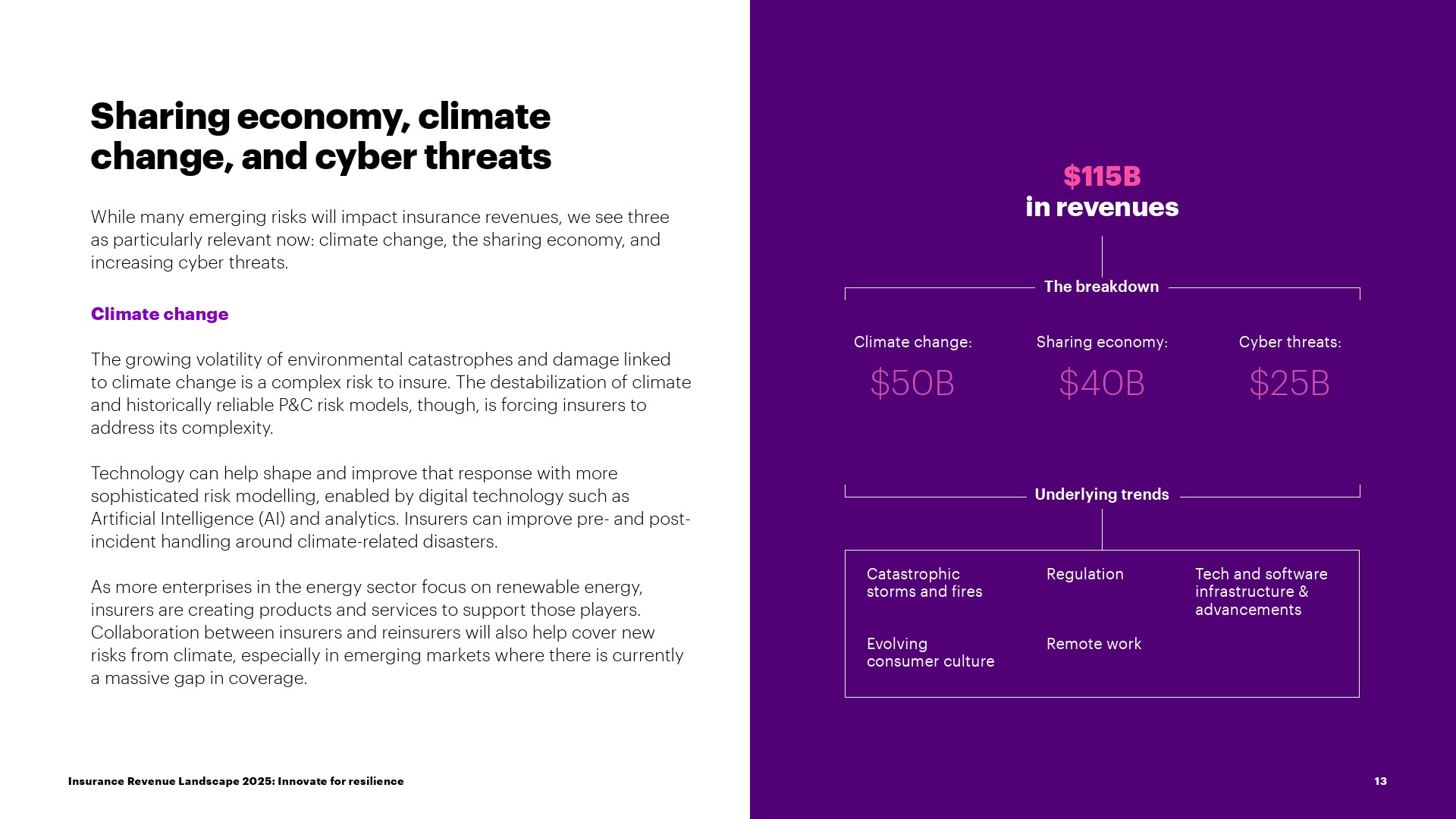 保险公司还将争夺新的收入,以覆盖新兴和新发展的风险。由于保险公司承保环境灾难风险,与气候变化相关的风险预计将构成500亿美元的新保险收入。随着网络威胁迅速增加,与网络威胁有关的覆盖范围和风险缓解服务预计将再产生250亿美元。利用数字技术(如人工智能和分析技术)改进事故前和事故后处理的保险公司将实现更复杂的风险建模和事故响应。