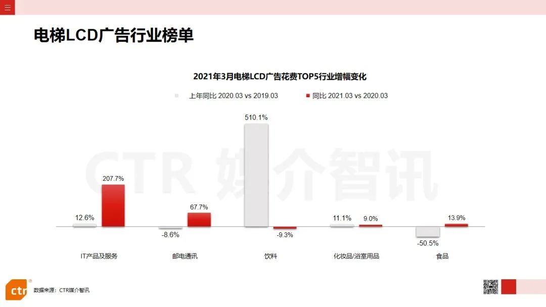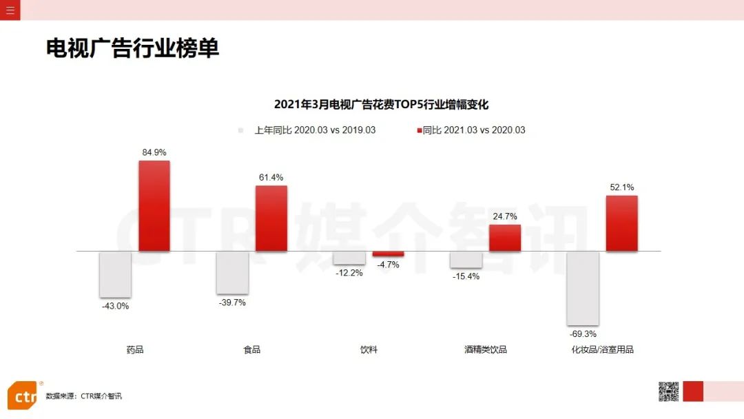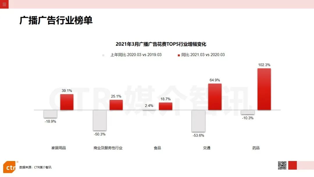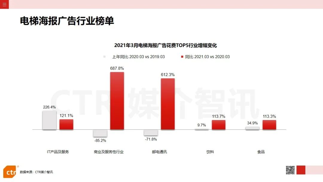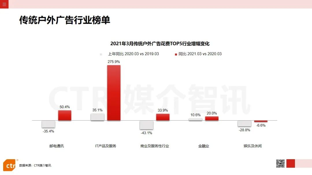 根据CTR媒介智讯的数据显示,2021年3月广告市场花费同比增长52.3%,环比增长4.1%。疫情后的恢复性增长还在持续,各个渠道的广告花费同比均有不同程度增长。从环比角度看,广播广告环比增长21.4%,传统户外广告环比增长6.7%,电梯LCD广告环比提升28.7%。
