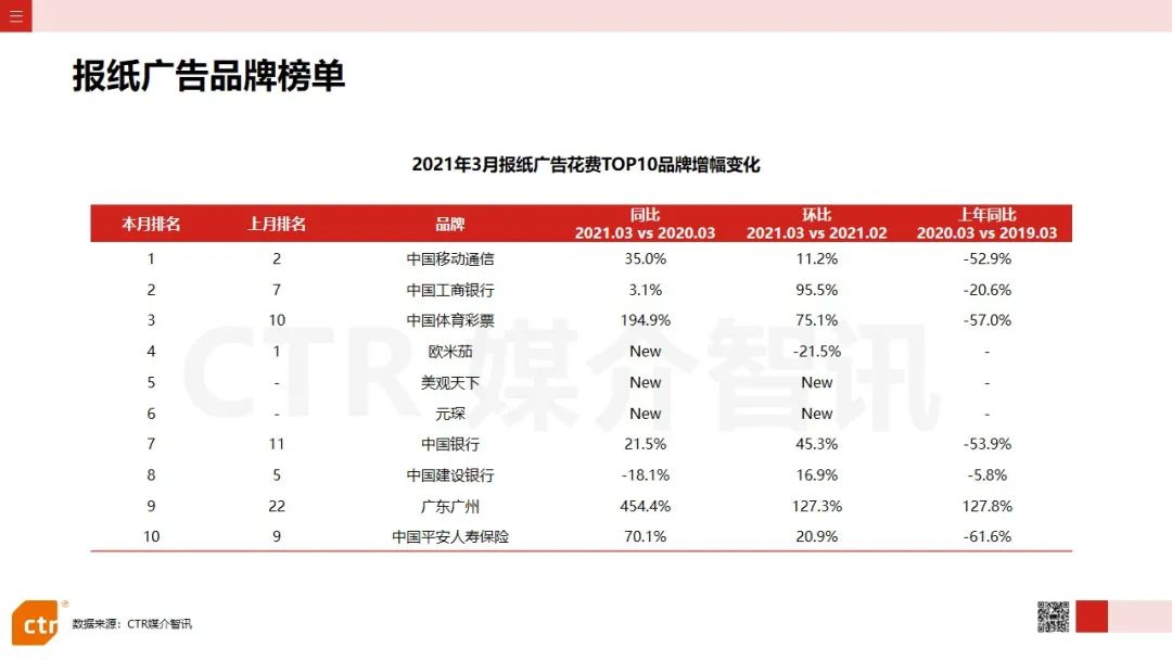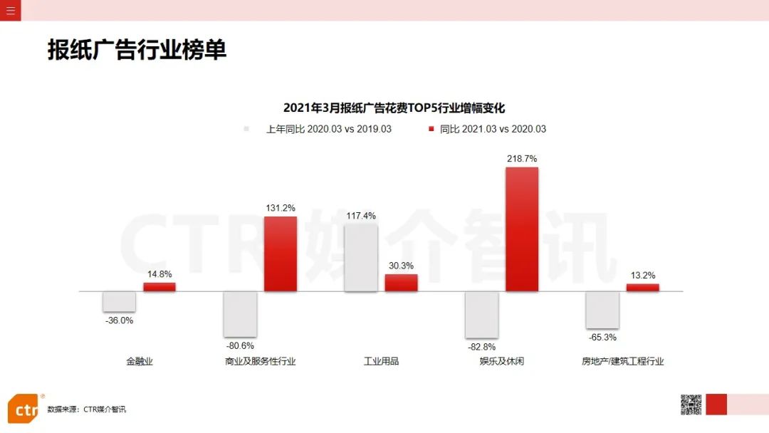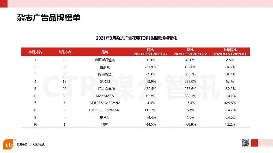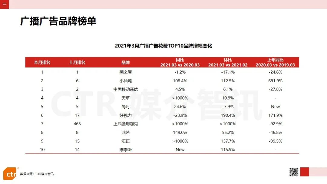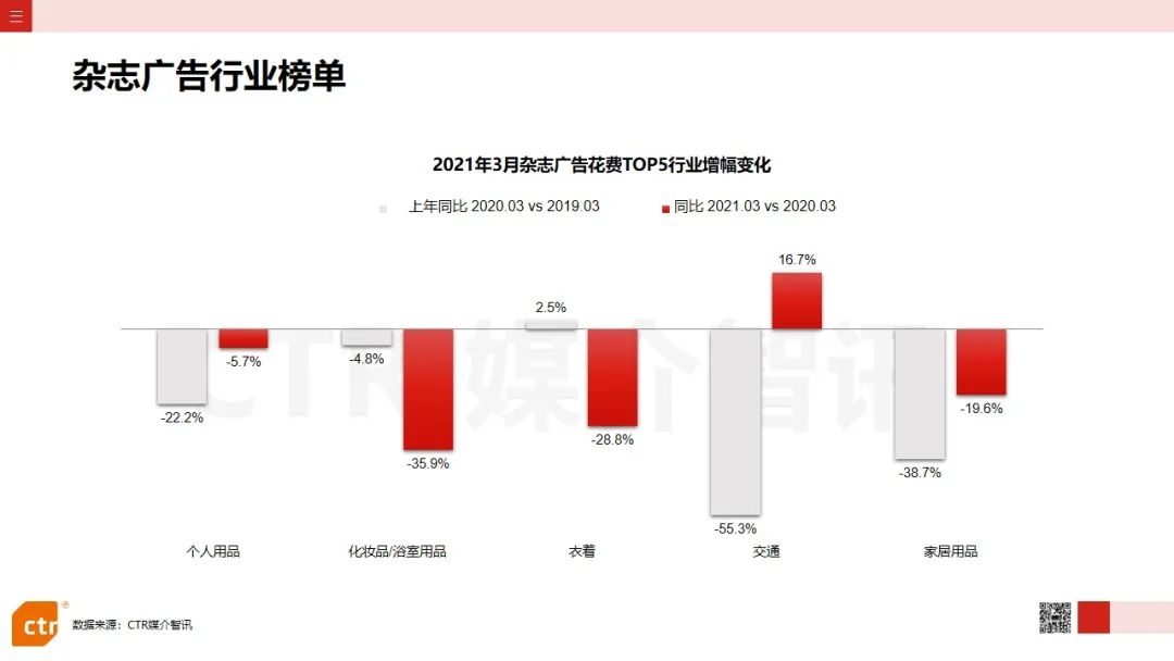 3月份,交通行业整体在广播广告的投放有明显的增长,同比提升64.9%,环比增长139.8%。4月份上海车展开幕,交通行业多个汽车品牌的广告投入有所增加。其中,上汽通用别克在广播广告的同比和环比增长均超过了十倍,大量广告围绕其重点产品别克昂科旗SUV和别克昂科威SSUV。据公开资料表示,4月18日,在上海世博中心举行的2021别克品牌日活动上,上汽通用汽车别克品牌隆重发布了全新中型SUV——别克昂科威Plus艾维亚。相信这款新产品很快会在新品广告投放榜单中名列前茅。除了上汽通用别克,一汽大众奥迪3月份的广告也有较大增长,其在杂志广告投放同比增幅为479.5%,环比增长276.6%。